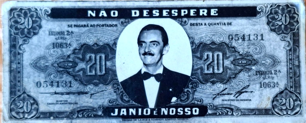 Peça da campanha eleitoral do candidato a presidente Jânio Quadros, do Partido Trabalhista Nacional(PTN),em Nova Trento apoiado pela União Democrática Nacional(UDN). A peça publicitaria foi encontrada por Jânio Cadorin, junto com documentos do falecido pai, Salvador Cadorin. Na cidade outros meninos nascido na época receberam o nome de Jânio em homenagem ao 22º presidente do Brasil que foi o primeiro a ocupar as instalações na recém inaugurada, Brasília. Foi também o governo mais curto de todos os presidentes do Brasil: 31 de janeiro a a 25 de agosto de 1961, quando renunciou. (Lembro que quando criança, encontramos no porão da casa do meu padrinho Jordão Cadorin, um punhado de botons, de fixar na lapela do terno, em formato de vassoura, símbolo da campanha de Jânio Quadros).