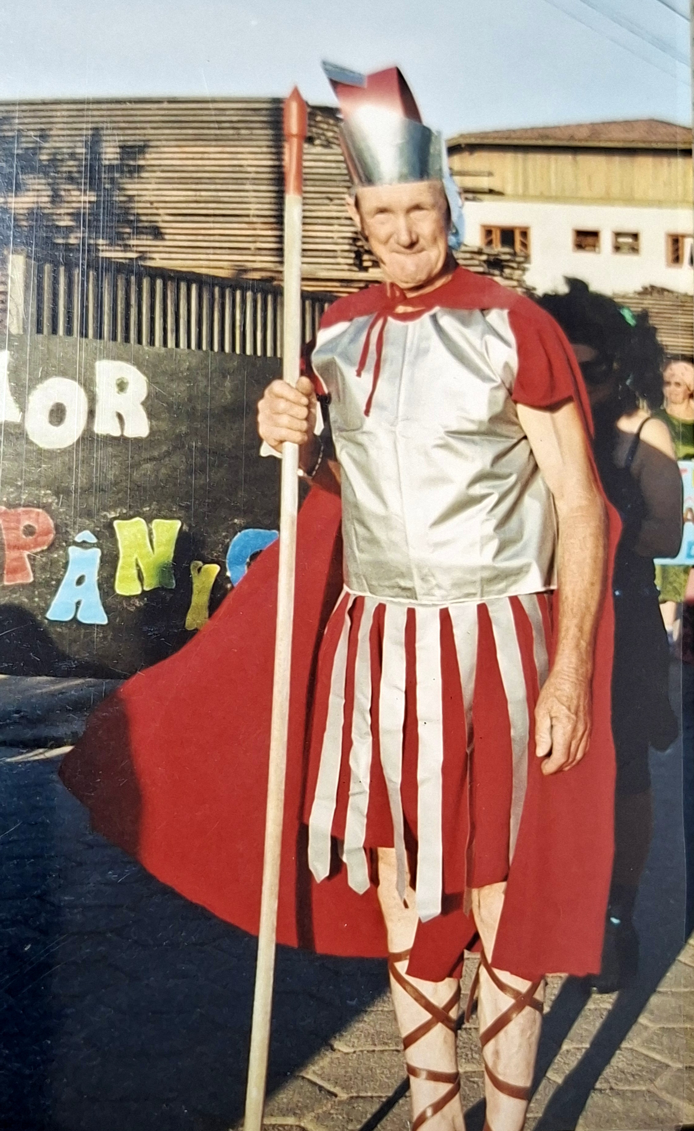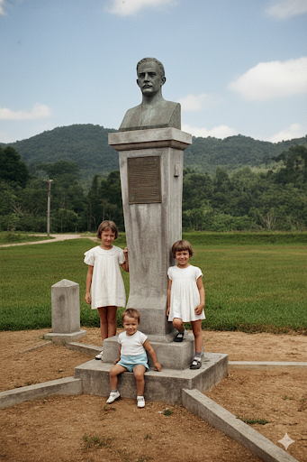 Cartão postal com as filhas do casal Romeu Boiteux Piazza e Aracy Baptista Pereira Piazza, posando junto ao monumento do bisavô coronel Henrique Carlos Boiteux, na atual praça Getúlio Vargas(antiga Galileu Galilei). São elas: Alba Heloísa Piazza(de Carvalho) 1924-2019), Maria Aparecida Piazza 1928 – 2017 e Mônica Piazza (morreu na tenra idade).