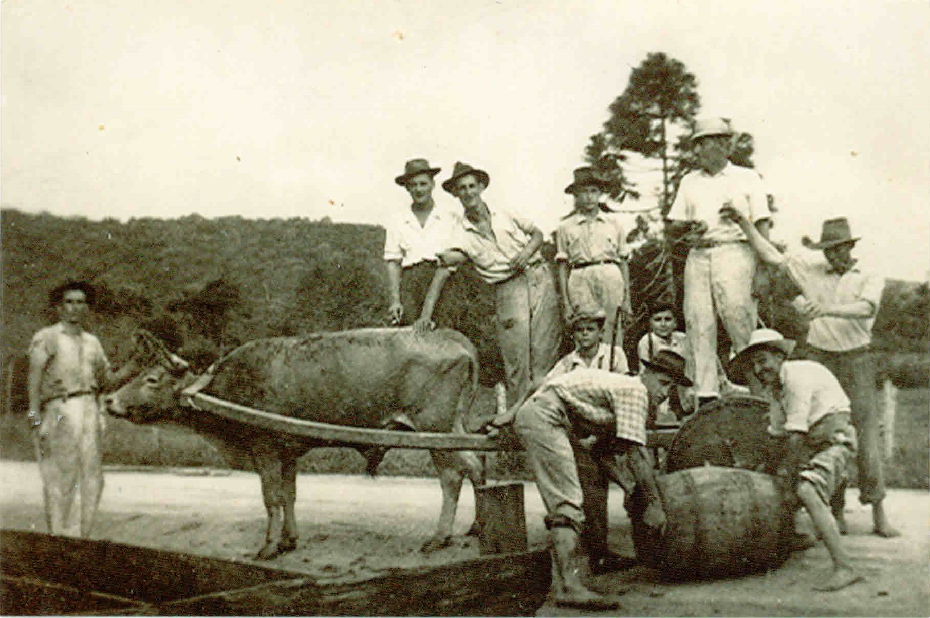 AMIGOS : Amigos do Bairro Besenello e Mato Queimado efetuando o transporte de um barril que deveria conter no seu interior algo muito precioso, pelo cuidado que estavam tomando, enquanto o transportavam com carro de boi.
