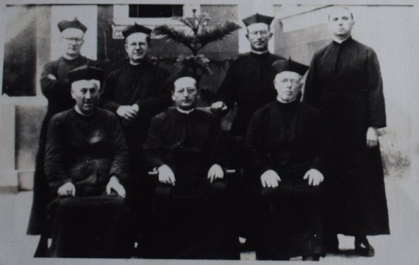 Sentados esquerda para direita: Pe. Afonso Kurzo, Oscar Hartmann, José Dapoian . Em pé, esquerda para direita: Pe. Afonso Persh, Pe. Ludovino Santini, Pe. Ely e Ir. Canci