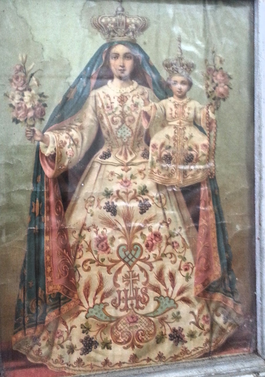 Foto de Nossa senhora da Glória que se encontra na sacristia da capela de Santo Estanislau Kostka, na Valsugana. A devoção a Nossa senhora fazia parte das regras da Cruzada Eucarística. A imagem traz detalhes florais, tipicos de trajes festivos poloneses. A pé da túnica aparacem bordadas o monograma JHS – Iesus Hominum Salvator” (Jesus Salvador dos Homens). O monograma foi adotado por Santo Inácio de Loyola, fundador da Companhia de Jesus, como emblema dos jesuítas. O papa Francisco, membro dos jesuítas, tem este monograma em seu escudo episcopal. Mais informaçoes sobre a devoção a a Nossa senhora da Gloria em https://cruzterrasanta.com.br/significado-e-simbolismo-de-nossa-senhora-da-gloria/26/103/. Foto e postagem: Jonas Cadorin