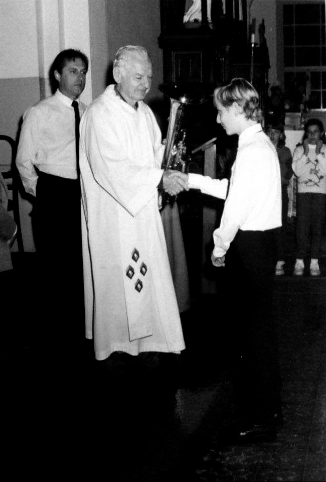 Padre Vicente Konzen(falecido) fazendo a entrega de instrumentos aos novos músicos da Banda Padre Sabbatini. Ao fundo o então maestro Moisés Cipriani e o menino é o atual maestro Adriano Bertotti. A cerimônia aconteceu no dia 23.05.1992 após a missa celebrada para marcar o evento.