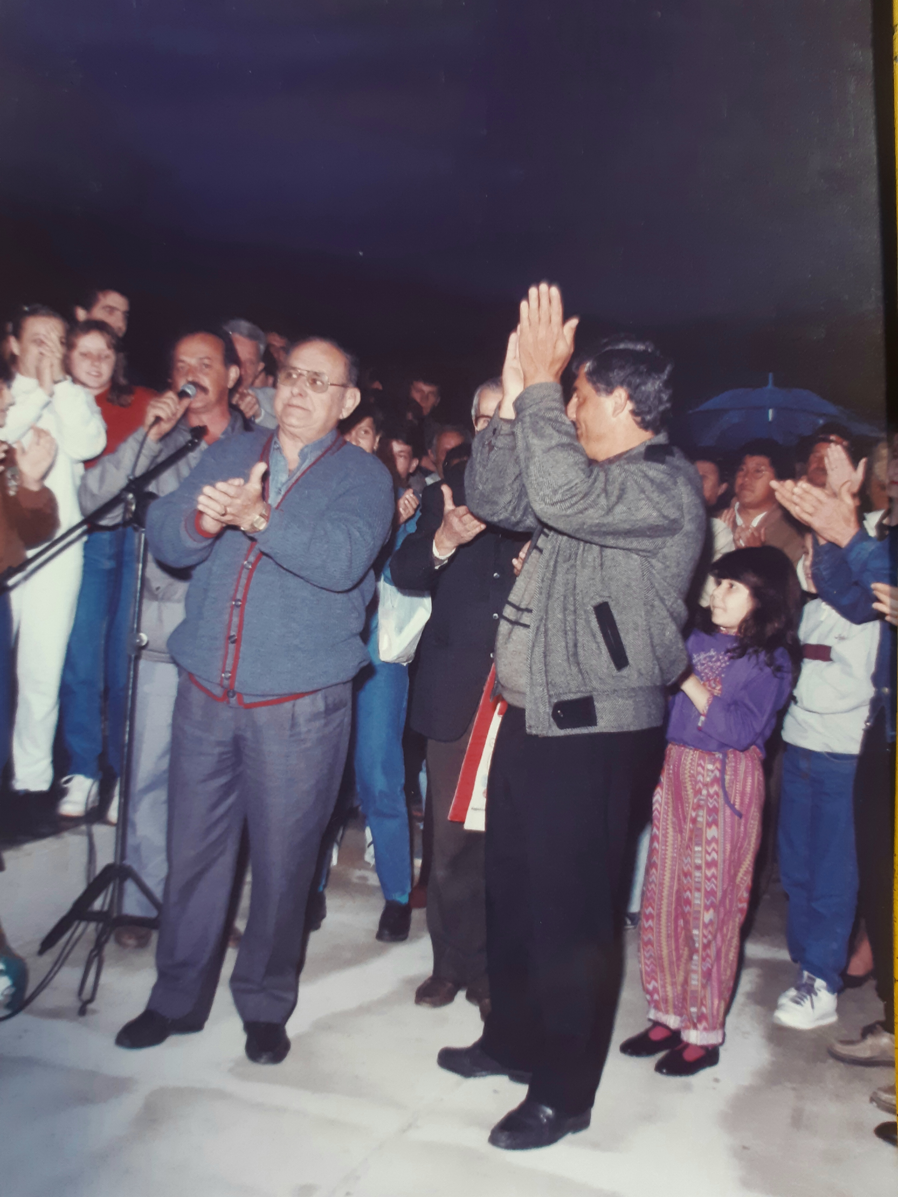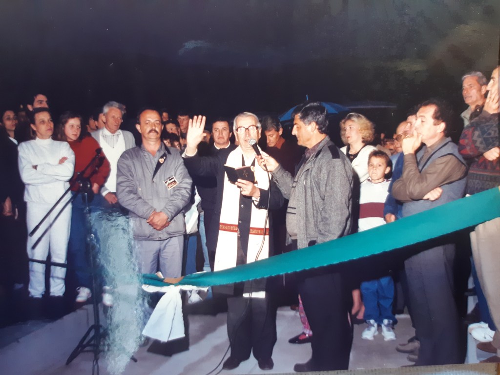 Inauguração do terminal Ângelo Maurici, no bairro Besenello. O evento ocorreu em agosto de 1992 em comemoração aos cem anos de emancipação política do município. Angelo Maurici foi o primeiro motorista a atender Nova Trento nas décadas de 60-70. Da esquerda para a direita: Sálvio Osmar Tonini, Padre jacob Melz, Saul José Rover, prefeito, Godofredo L. Tonini, . Ao alto o falecido Osvaldo Boso. Ao fundo os vereadores Valentim Marcolla e Sandra Eccel Rachadel