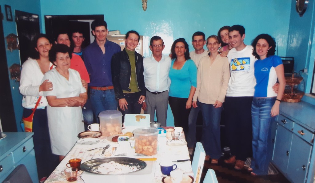 Grupo de jovens Giovanni In Gamba, do Circolo Trentino em mais uma serata cultural entrevistando Firmino Franzoi, um dos pioneiros na fabricação de fogos de artificio em Nova Trento.