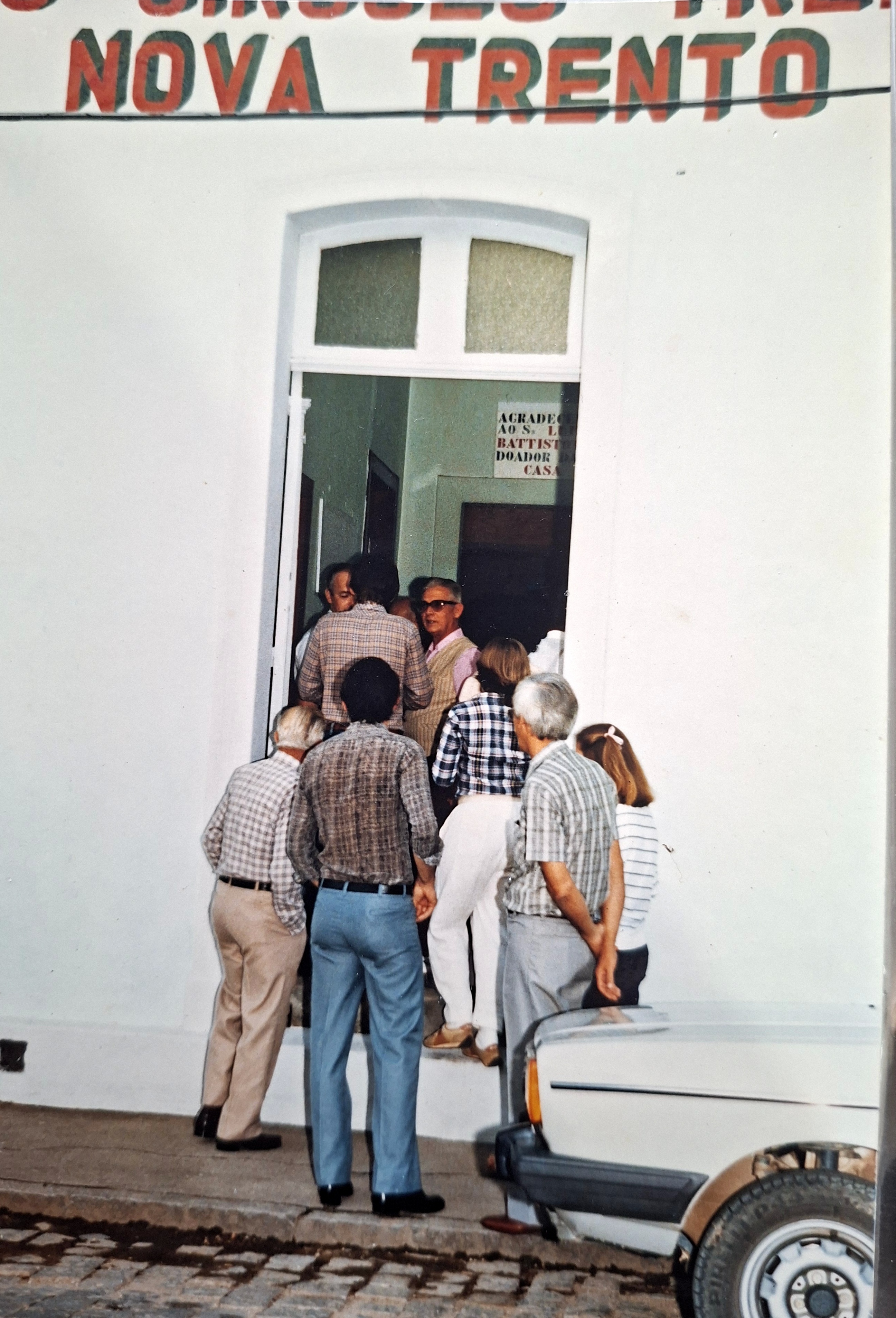 Antiga sede do Circolo Trentino, no casarão da família Battistoti, na rua Marechal Deodoro da Fonseca. No cartaz na entrada se lê: ” agradecemos ao sr. Luiz Battistoti, doador da casa.” Fioravante Marchi, (Vantinho), professor que marcou a educação em Nova Trento, aparece de frente na foto.