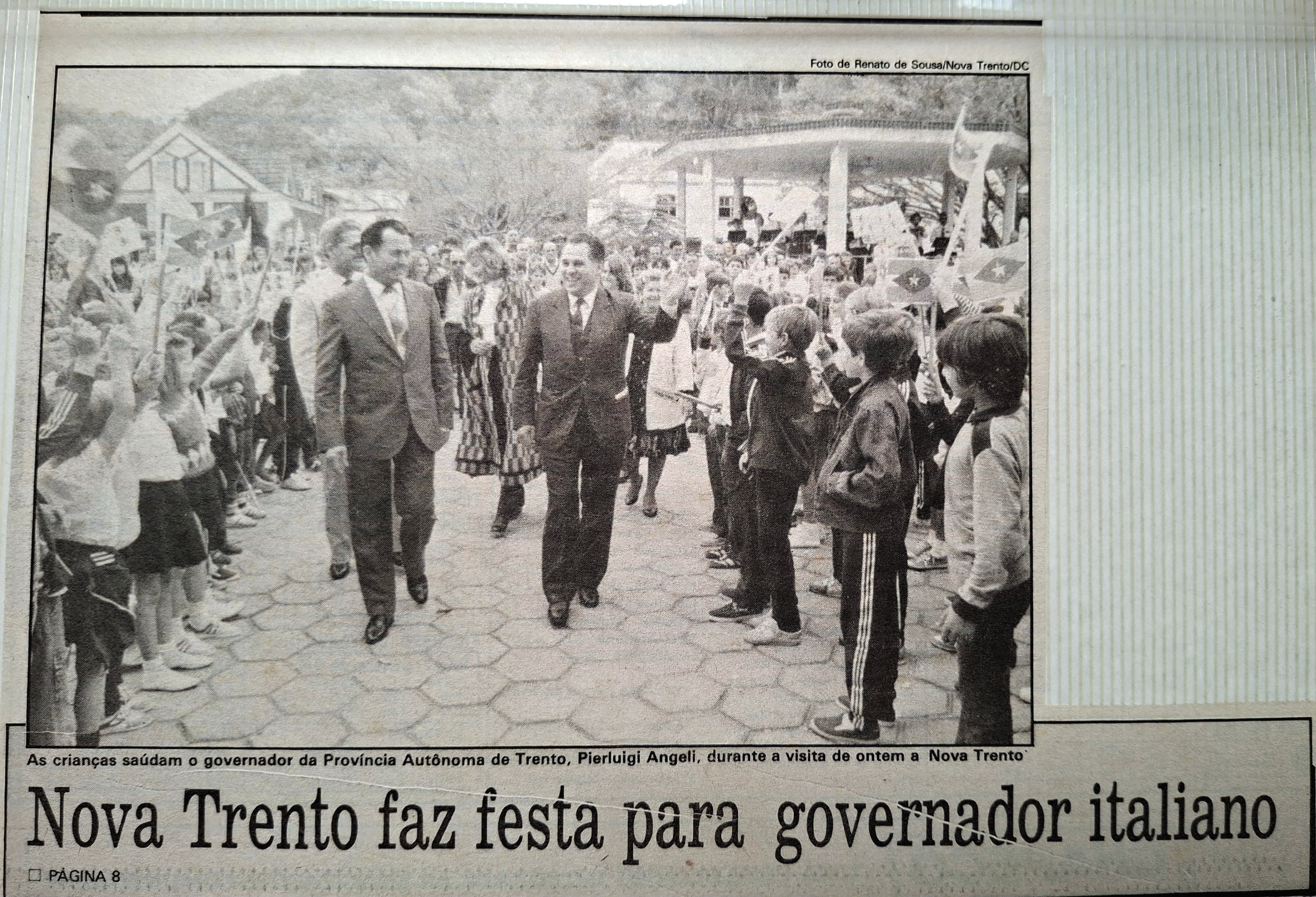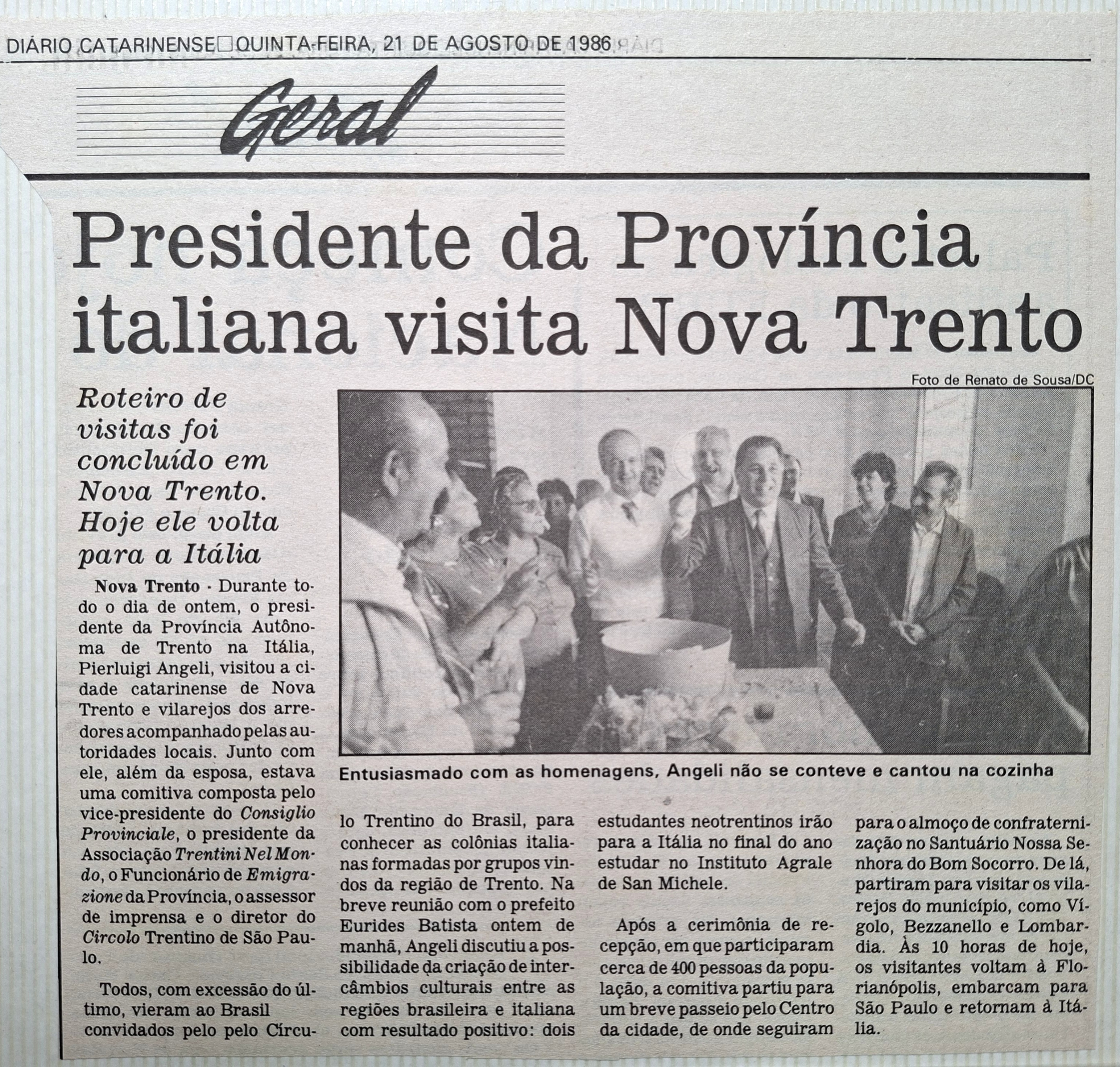 Dando continuidade as iniciativas de aproximação da colônias de imigrantes trentinos em Santa Catarina com a Província Autônoma de Trento, o presidente Pierluigi Angeli visitou Nova Trento em 20 de agosto de 1986 sendo recebido pelo prefeito Eurides Battisti.