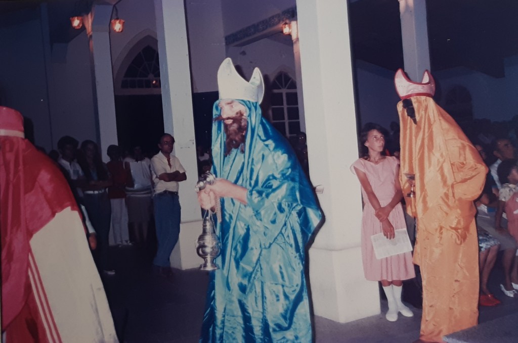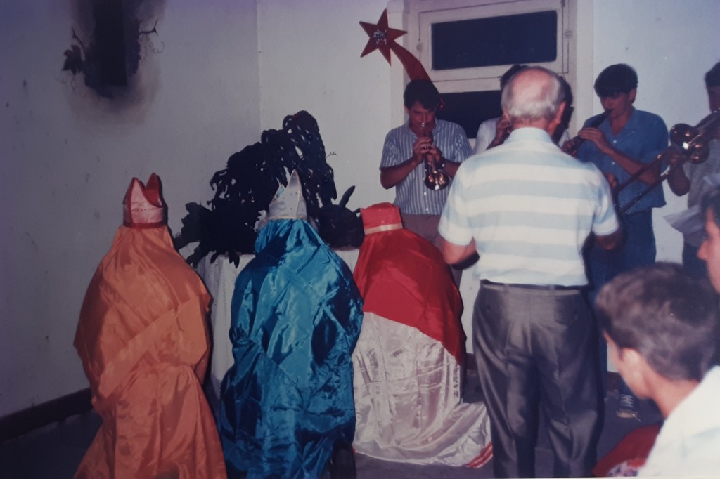 Os reis eram seguidos por um grupo de músicos e cantores. Na foto, o saudoso maestro Virgilio Tomasi rege os músicos que entoavam canções em dialeto e em português, mesclando a tradição dos Stellari e do Terno de Reis.