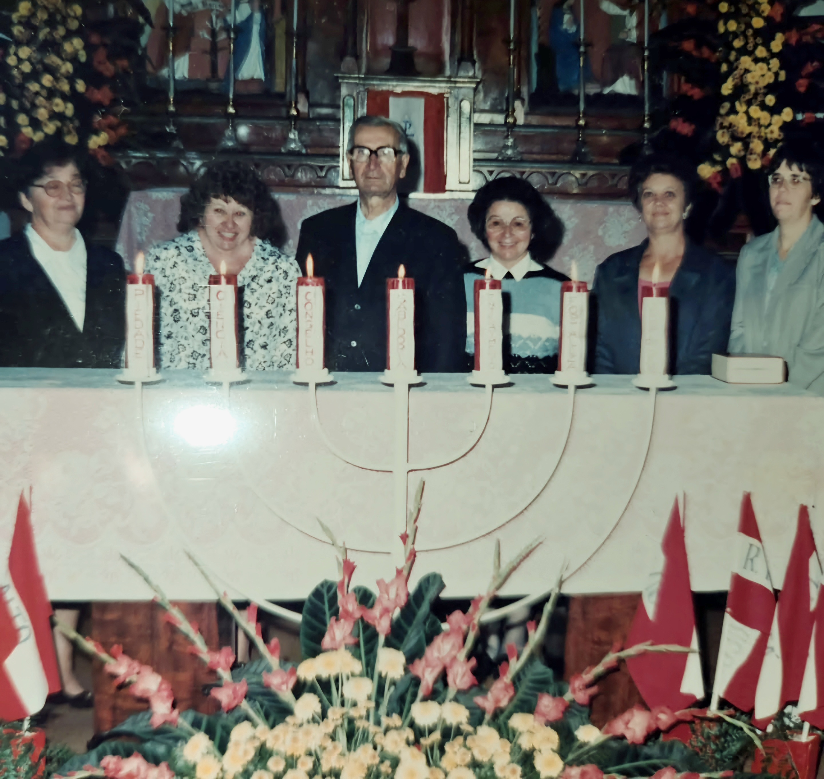 Grupo de catequista do Crisma da sede da paroquia juntamente com o padre vigário. O castiçal com sete velas lembra os sete dons do espírito santo. Da esquerda para a direita: Apolônia Bertotti, Nelita Valle, Padre Jacó Melz, Irmã Herci Reis, Ester Tonini Piazza, Maria Helena Dalri