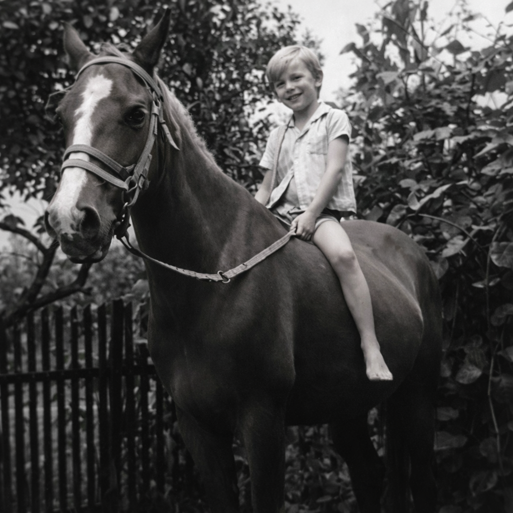 Ronaldo Raulino, filho de Horácio Raulino e Maria Luiza Shneider, nos tempos de infância em que tudo era motivo para diversão. Imaginem montar um cavalo quando os filmes de western eram sucesso!