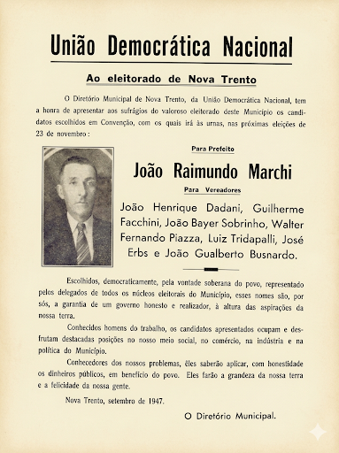 abr 10 2026 SETEMBRO DE 1947- JOÃO RAIMUNDO MARCHI Propaganda eleitoral da UDN (União Democrática Nacional), para prefeito e veradores no ano de 1947. Na época não havia o cargo de vice prefeito. Fonte: Arquivo pessoal Jonas Cadorin. (Imagem melhorada com IA, preservando a integridade do conteúdo.) Compartilhe isso: Compartilhar no X(abre em nova janela) 18+ Compartilhar no Facebook(abre em nova janela) Facebook Curtir Carregando... Relacionado