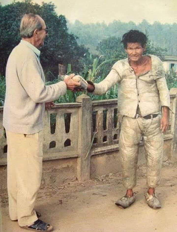 Senhor Valmir Telles, morador do bairro Joáia em Tijucas dando uma ajuda ao andarilho conhecido como japonês ou homem de plástico devido a roupa que havia confeccionado para se proteger da chuva. Percorria o vale do rio Tijucas, passando muitas vezes por Nova Trento. Pouco se soube sobre ele. Morreu atropelado, na década de 1990, sem receber socorro, as margens da SC411. Ele era daquelas pessoas que passam, muitas vezes, como invisíveis por nós mas que cumprem seu papel de nos lembrar que somos todos humanos, cada um do seu jeito! Em Nova Trento tivemos pessoas que marcaram época: a negra Vitalina, o velho Gregório, o aleijadinho da carroça, o Ponticelli, o homem dos balaios(Stédile), o casal Andrea e Angelina… Se você que nos segue tiver alguma foto, por favor, nos envie, eles também fazem parte da história de Nova Trento.(Pode deixar sua mensagem no balão no lado superior da foto.)