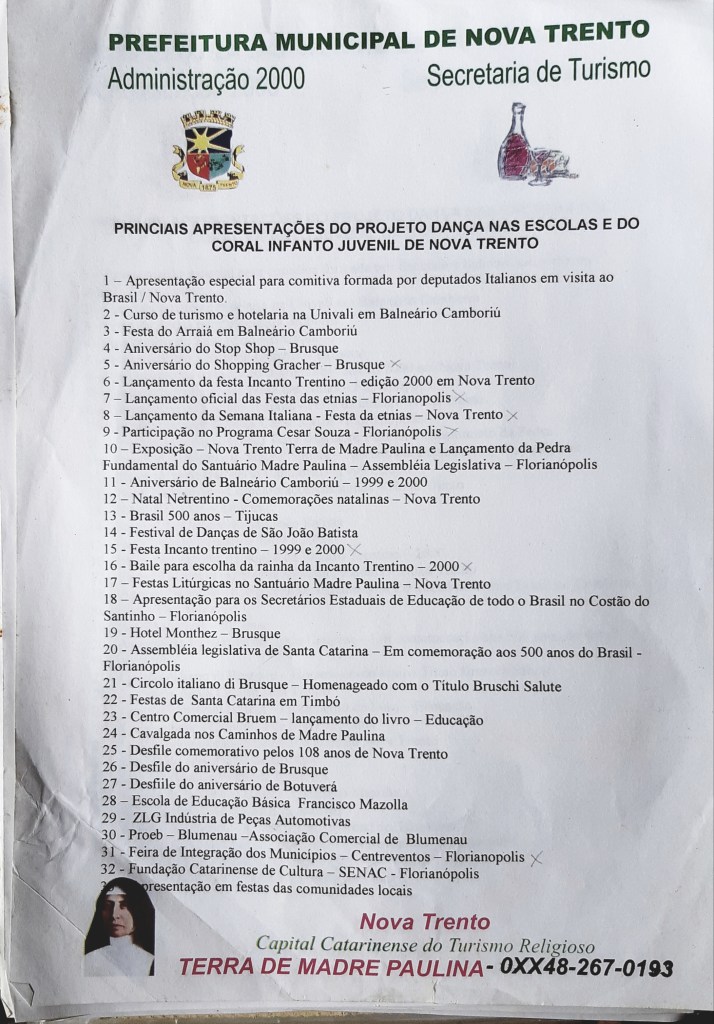 Professora Cleonice Teresa Tomasi Darós regendo o coral infanto-juvenil em 25 de março de 1999. Um incentivo a cultura (que deveria ser institucional, independente da troca de comando político) que foi se perdendo ao longo dos anos. Nova Trento, ao contrário de outros munícipios, não precisa ‘inventar’ atrações turísticas. Elas existem e precisam ser valorizadas e organicamente incentivadas.