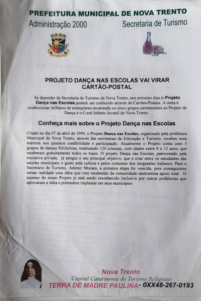 Nesta e nas próximas três postagens publico um dossiê (que recolhi do lixo) de um projeto cultural que poderia ter mudado a identidade das nossas festas “trentinas.” Um projeto que movimentava todas as comunidades e nacionalidades que colonizaram Nova Trento. Foi uma época em que não só as crianças ,mas também seus familiares, começaram participar dos eventos sem vergonha de usar um traje tradicional. Penso que enquanto não tivermos clareza de objetivos sobre o realmente queremos para a cultura e turismo local, continuaremos a fazer eventos de identidade duvidosa.