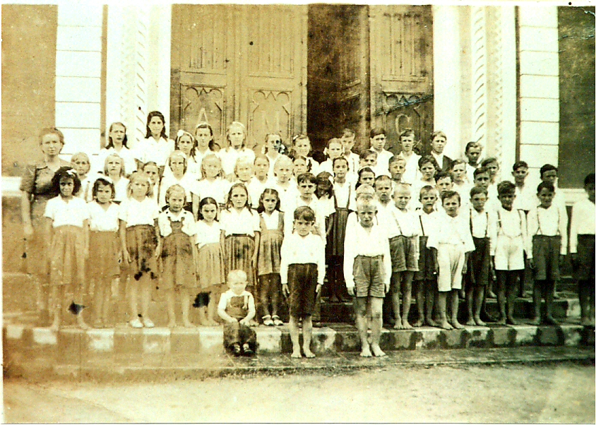 Turma de alunos do colégio do centro de Nova Trento posando para foto defronte a igreja matriz. Nesta época calçado infantil era artigo de luxo.quase todas as crianças estão descalças). A clássica divisão: meninas de um lado , meninos do outro! A foto não tem identificação das pessoas. No lado esquerdo da foto, ao fundo é possível visualizar as professoras.