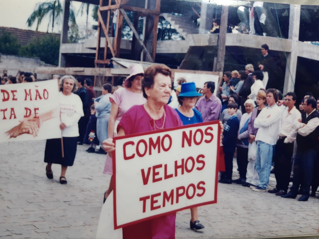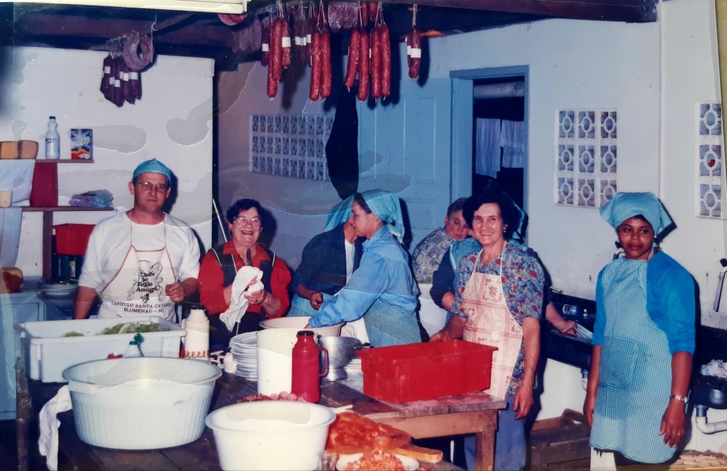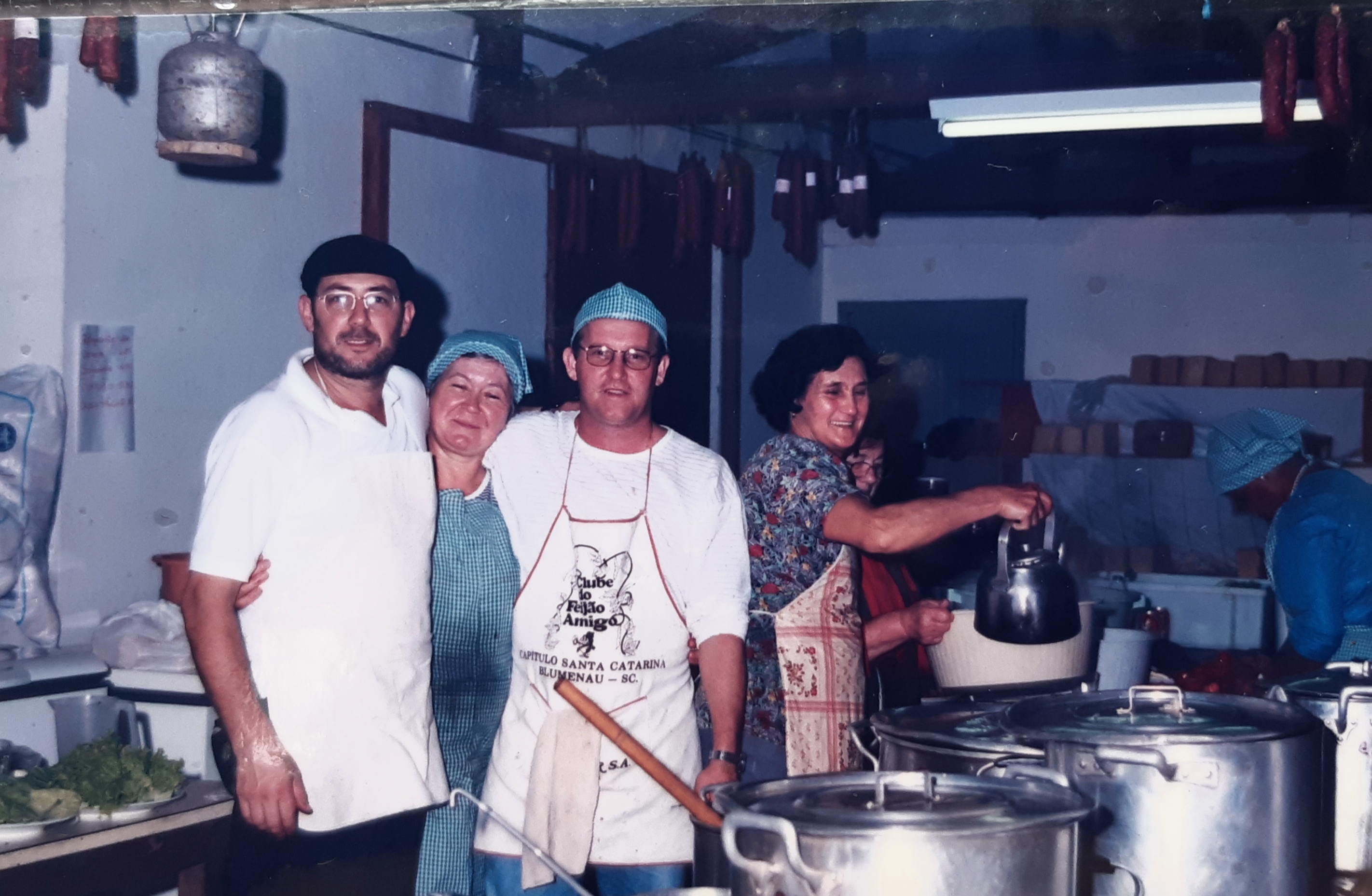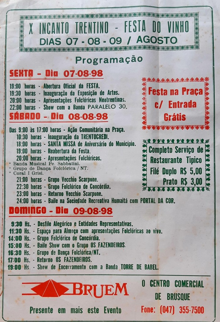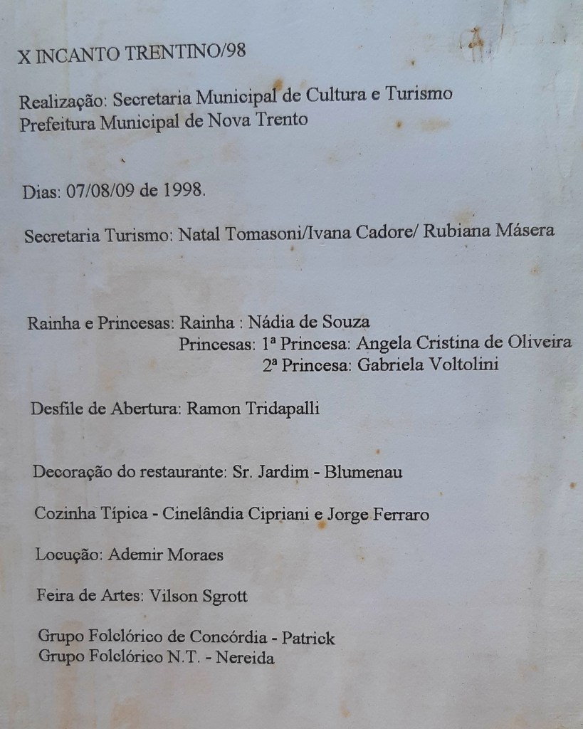 Em 08 de agosto de 1999 o Jornal de Santa Catarina noticiava a realização da 11ª festa Incanto Trentino – festa das tradições trentino italianas – num pavilhão de lona montado em frente a prefeitura. Na foto a rainha da festa Danuza Almeida, rodeada por meninas do projeto Dança nas escolas.