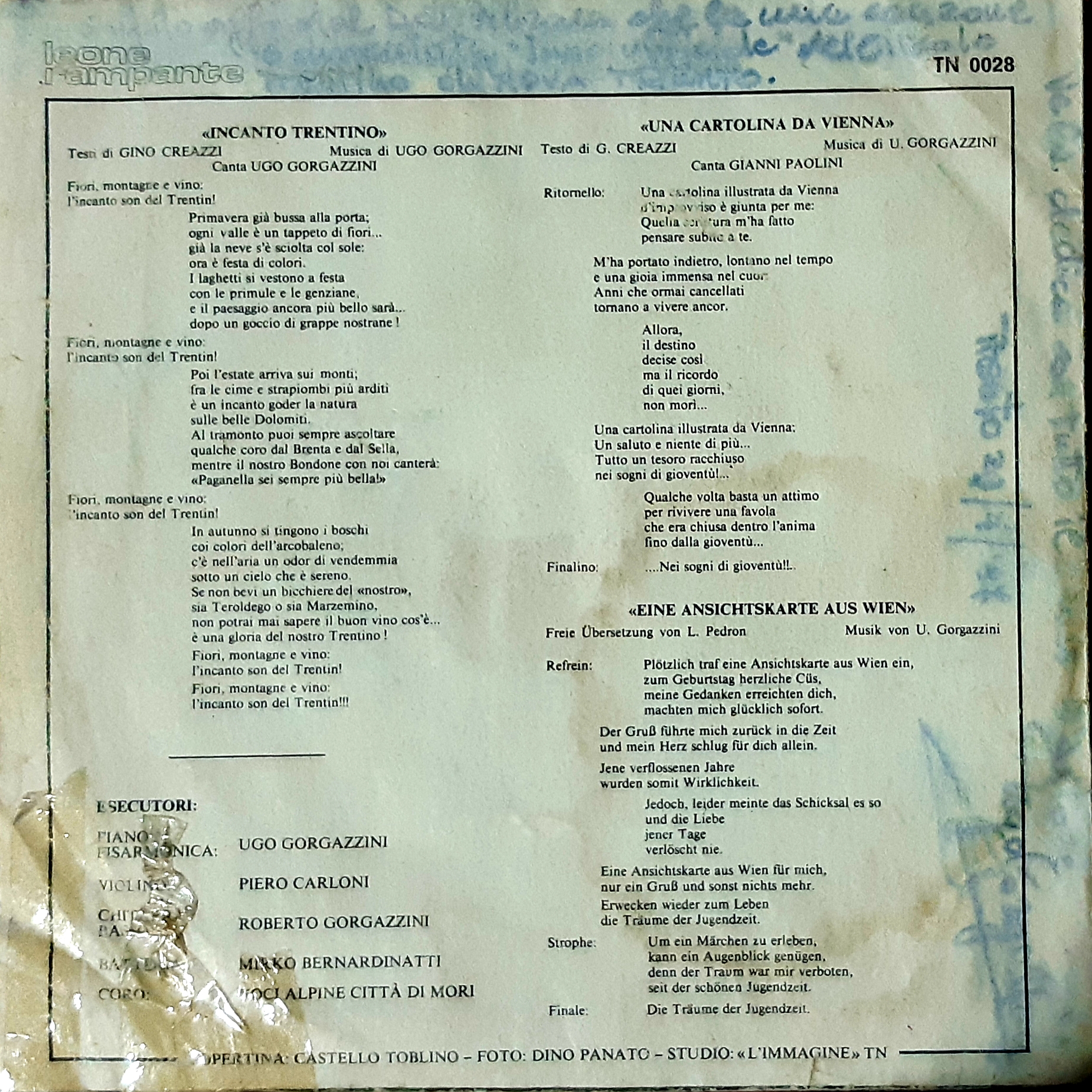 Na dedicatória, quase ilegível, está escrito: Oh saputo oggi dal Dott. Alozae(?) che la mia canzone é diventata “inno ufficiale” del Circolo Trentino di Nova Trento. Ve la dedico con tutto il cuore. Trento 29.07.1987. Assinatura: Ugo Gorgazzini ( Soube hoje pelo doutor Alozae que a minha canção se tornou o hino oficial do Circolo Trentino de Nova Trento. Vo-la dedico de coração. Ugo Gorgazzini. Trento 29 de julho de 1987)
