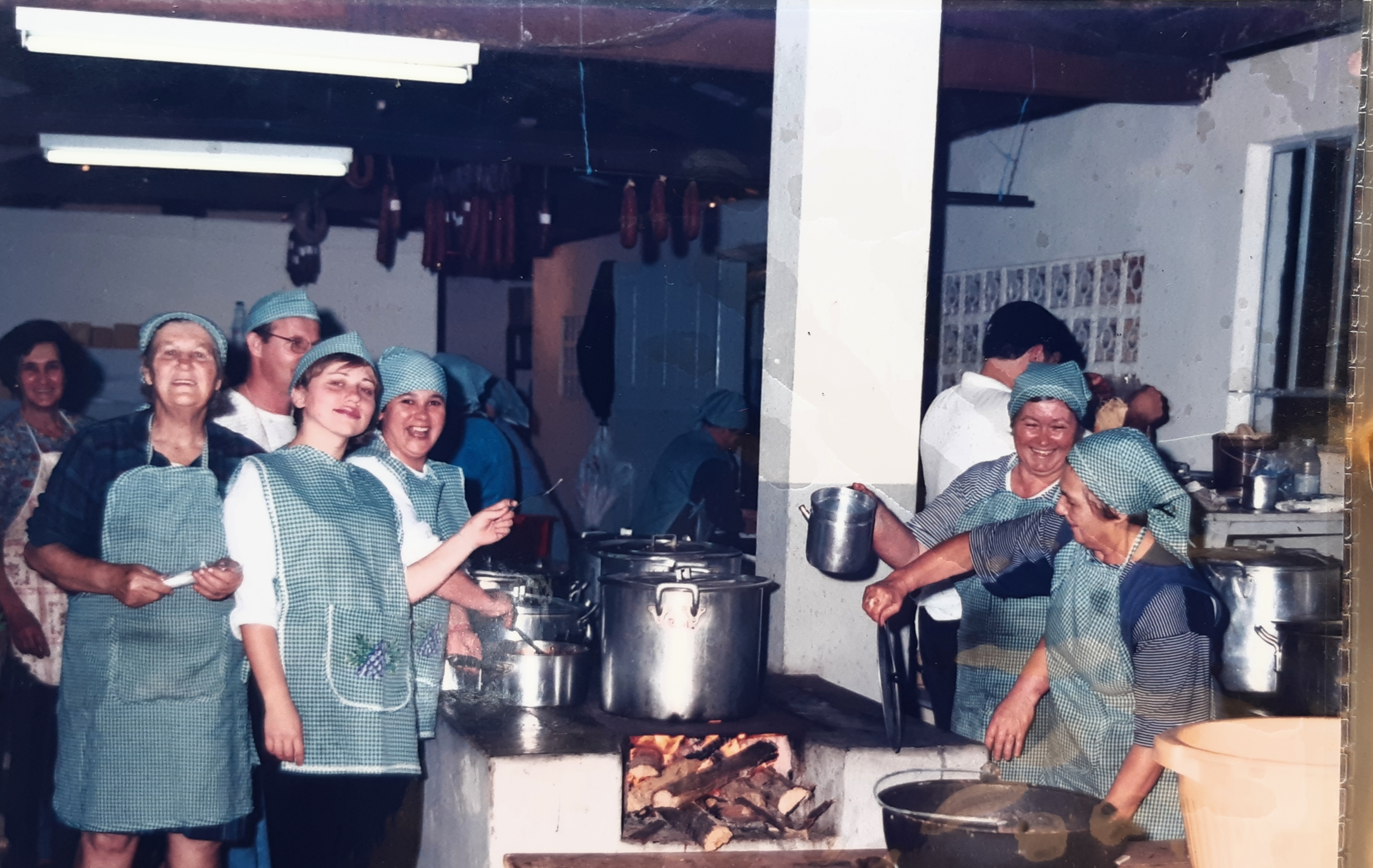 Grupo de senhoras da Casa dei Nonni reunidas em frente barraca do café durante a festa Incanto Trentino. Ao fundo de esquerda para a direita: Glória Valle, Realina Rover, Iolanda Valle, Raquel Polli Sousa. Sentadas ? moça, ?criança, Elvira Rover, Irene Voltolini, Inês Valle