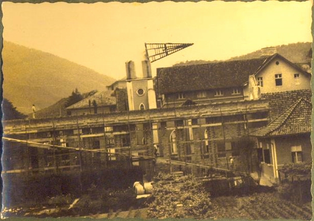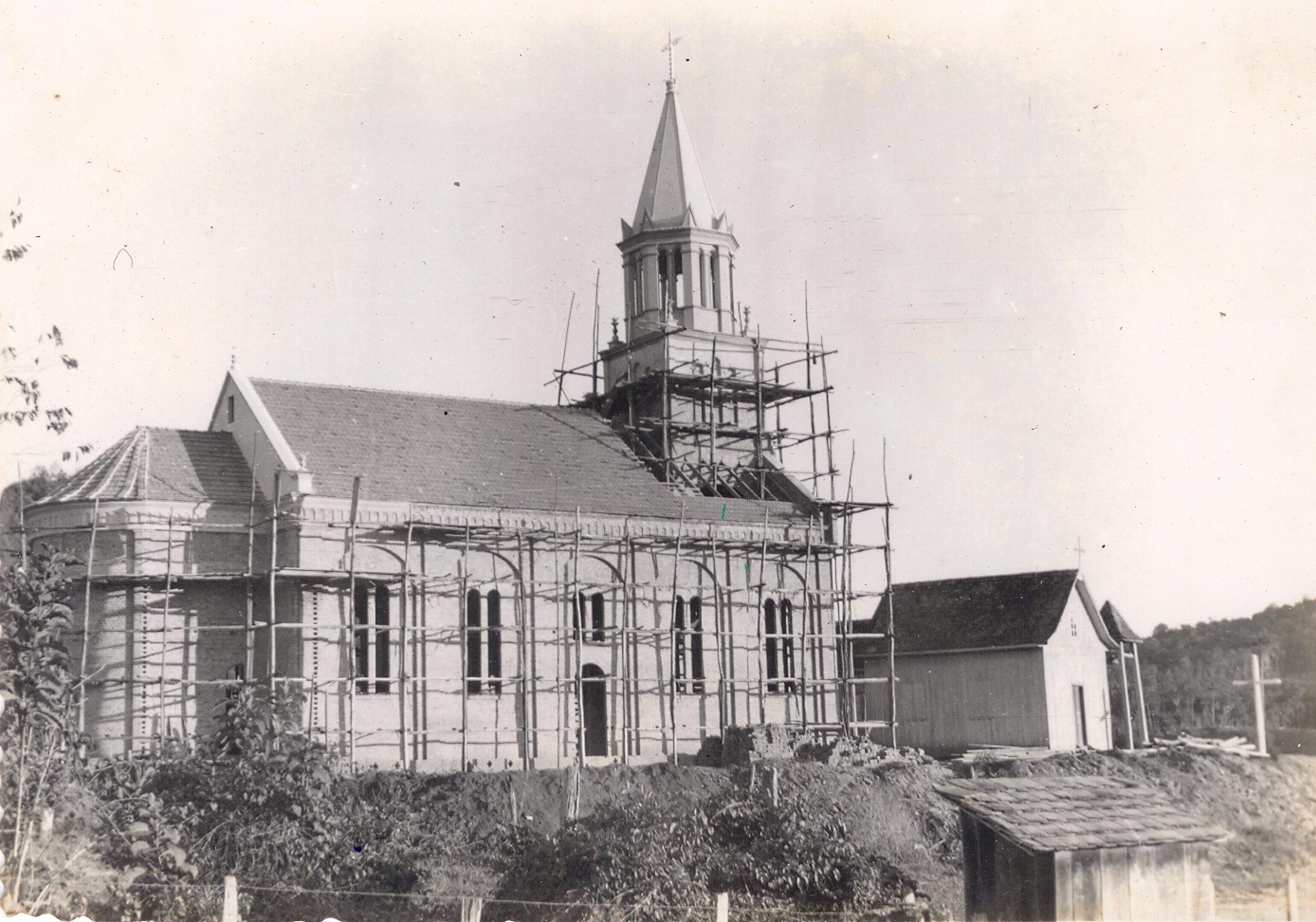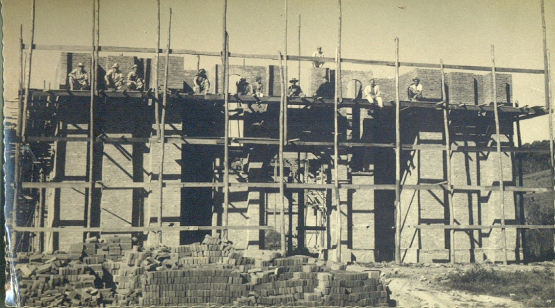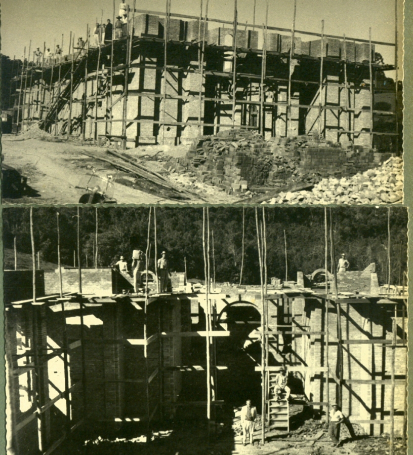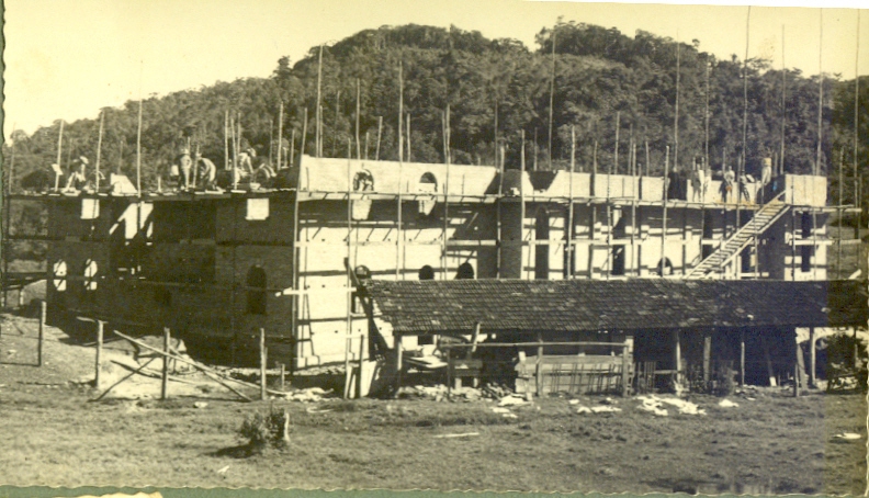 Famosos pela qualidade e esmero na execução de suas obras, os pedreiros de Nova Trento se tornaram uma marca registrada da cidade. Ao fundo e abaixo a casa de retiros Vila Fátima no Morro das Pedras em Florianópolis e testemunha do trabalho de nossos antepassados. A casa é toda de pedras que foram cortados e transportadas em padiolas nos arredores da construção. No centro da foto no lado direito do padre, Constante e Salvador Cadorin. No lado esquerdo o renomado mestre de obras, Francisco Cadorin.( Ao fundo próximo a rampa, José Cadorin(Bépe), sentado, segurando o bolim, Plácido Cadorin, que casou e constituiu família na comunidade do Morro das Pedras.( Aceitamos contribuições para identificação dos demais).