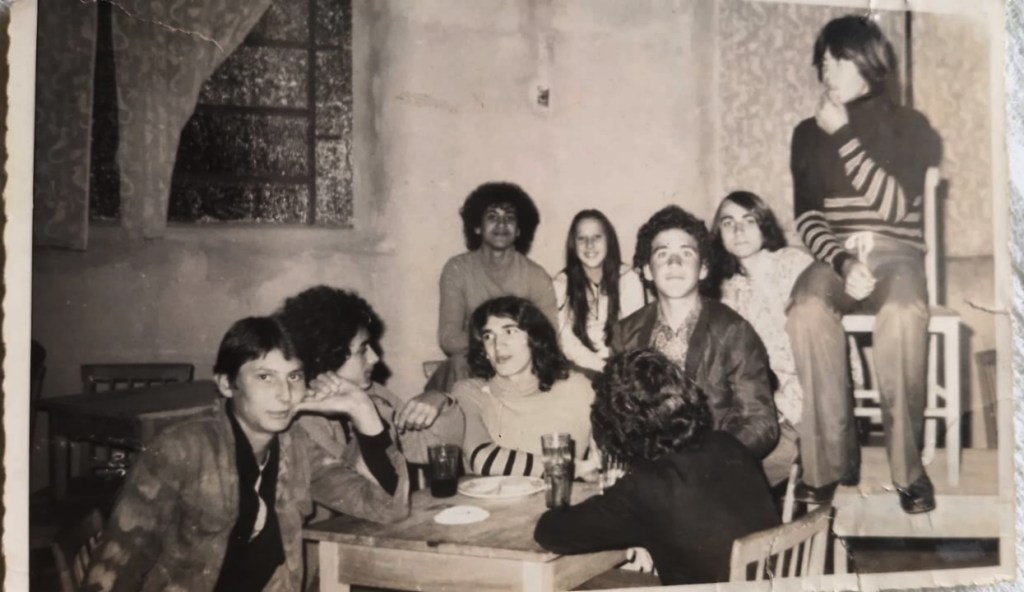 Março de 1974, tarde dançante na Sociedade Recreativa Primavera. época da calça boca de sino, salto alto, cinturão de fivela, cabelos compridos, influência do movimento Hippie…os amigos da esquerda para a direita: Vilmar Abelino(Baco), Élcio Marchi(Niquinha), Herberto Marchi(Betinho), Sergio Luz, Leonir Demonti, … Luiz Luz, Edson Mazzola.