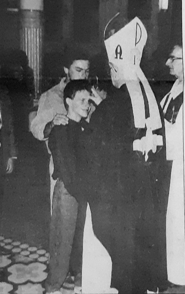 Cerimônia do Crisma igrje matriz de Nova Trento. Na foto Ademir Bottamedi com o crismando Sérgio Bertotti (Serginho), Dom Eusébio Sheidt, Padre Jacó Melz.