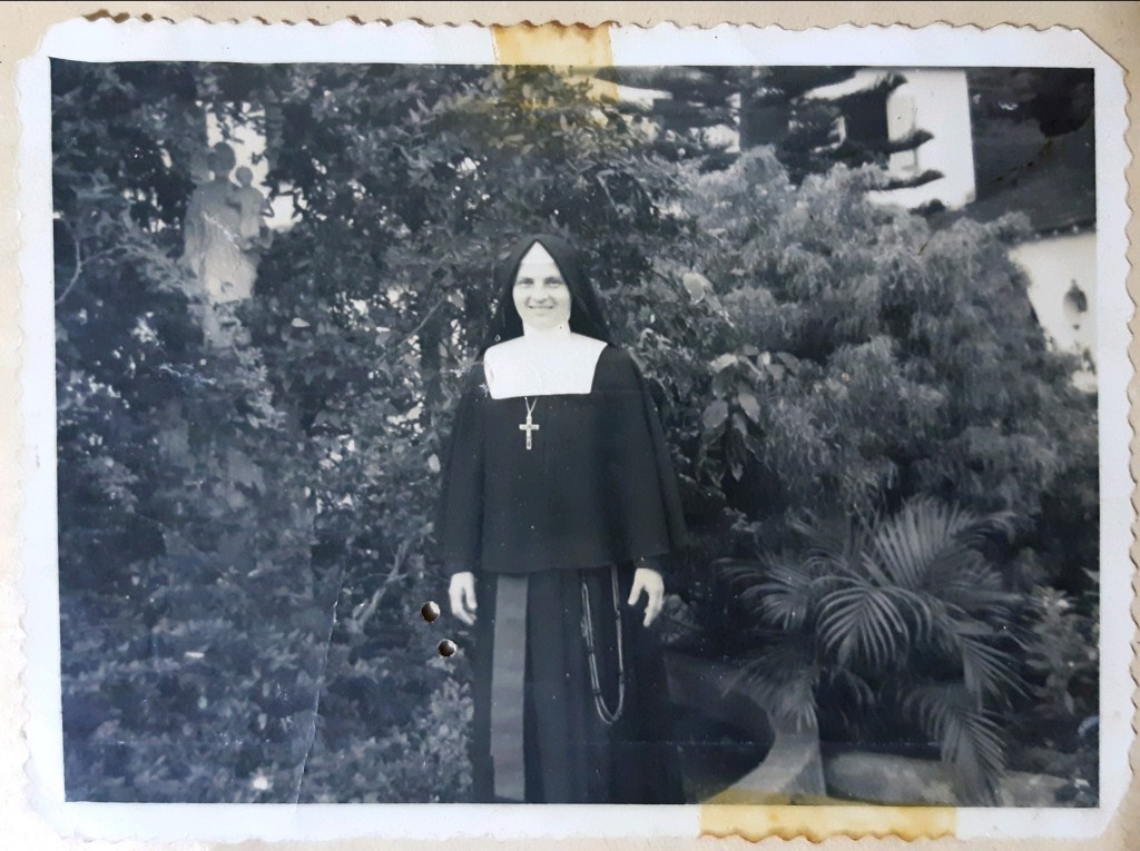 Cecilia era filha de Alberto(Tino) Bertotti e Francisca Bottamedi Bertotti. Ingressou ainda menina no juvenato das Irmãzinhas da Imaculada Conceição em Nova Trento. Na foto ela veste o hábito antigo das irmãs com a fita azul sobre o preto do hábito. Quando professou os votos religiosos mudou seu nome para Irª Sabina Maria. a troca de nome era uma prática de antes do concílio Vaticano II. A justificativa era mostrar o rompimento da religiosa com o a vida que deixava para trás. Ao fundo a estátua de são José , patrono da congregação.( Na família de Cecilia eram em doze filhos, dez homens e duas mulheres. É desta família que são os padres Luís e Pe. Egídio. A família vivia da agricultura e residia no inicio da estrada que leva o bairro salto, próximos ao oratório de são Roque.