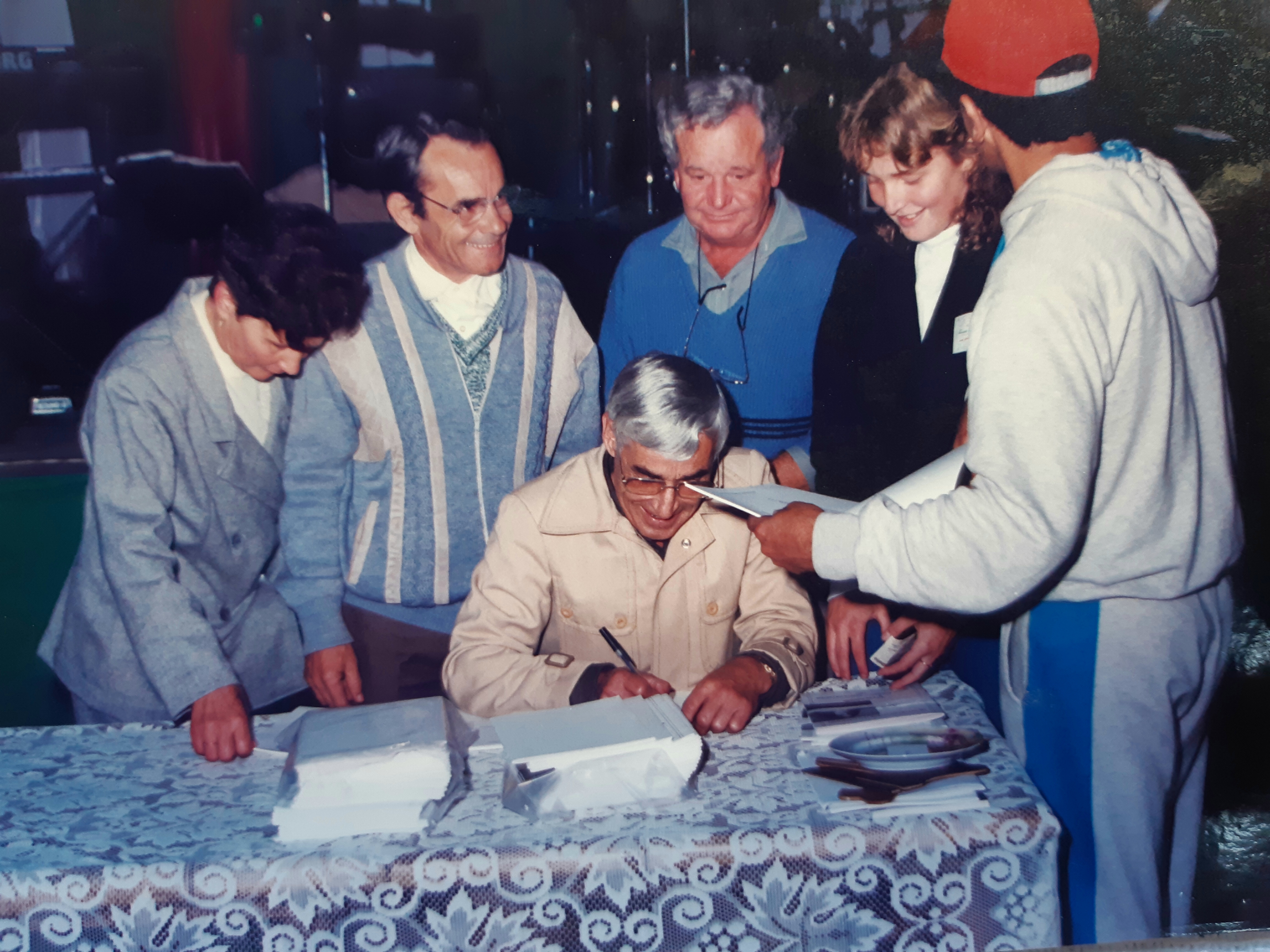 Na semana do munícipio em agosto de 1992, o professor Newton Benvenuto Cadorin fez o lançamento de uma coletânea de poesias sobre Nova Trento. Da esquerda para a direita Maria de Lourdes Bertotti, Mário Merizio, Moacir Facchini, Graciana Cadorin(sua filha) ao centro Newton autografando o livro para os presentes.