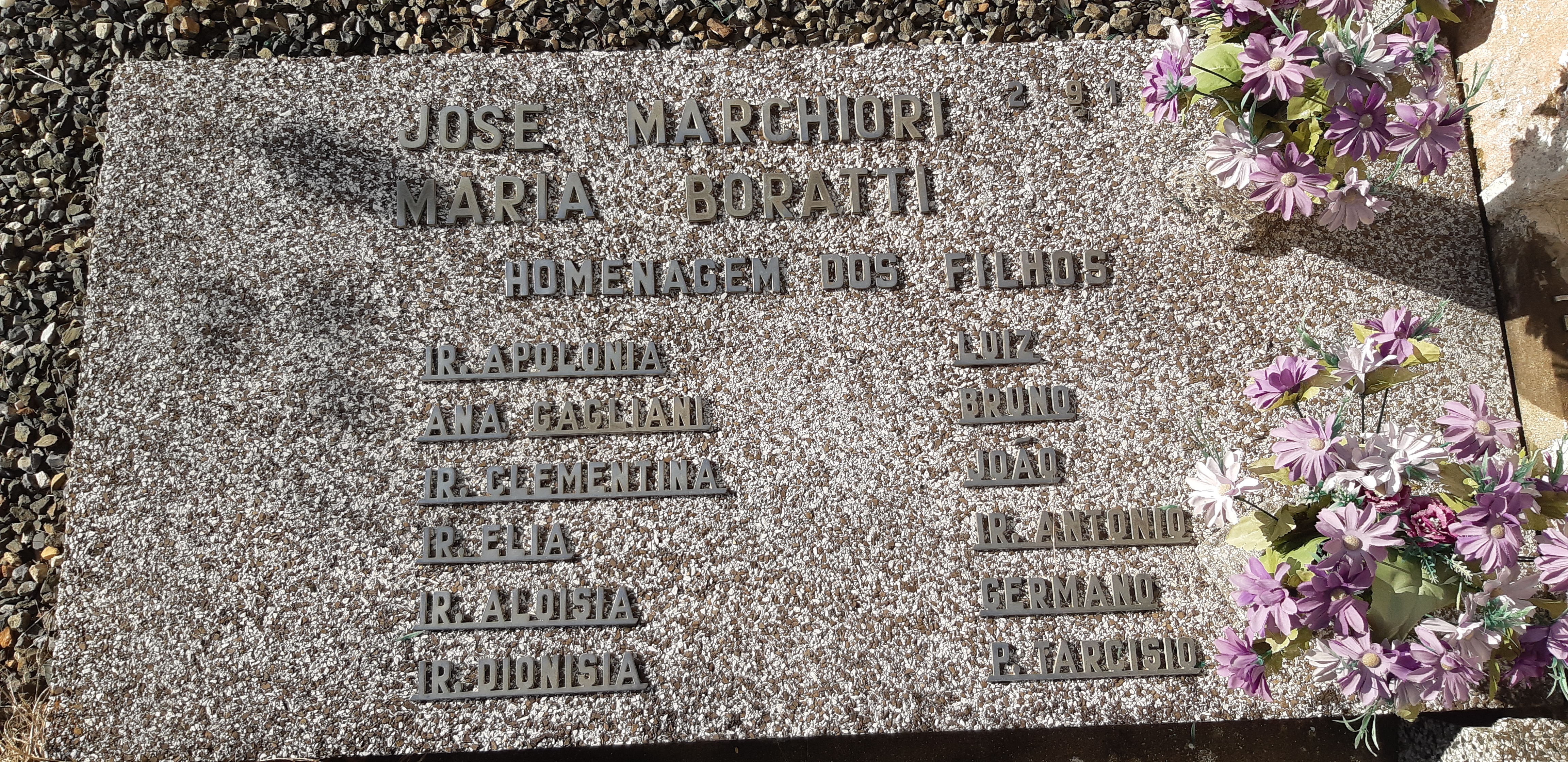 Uma das poucas lápides antigas do cemitério do bairro São Luiz passa desapercebida do olhar, por não trazer nenhuma foto e estar no nível do chão. A lápide traz uma homenagem dos doze filhos(seis meninos e seis meninas) do casal José Marchiori e Maria Boratti(cujos pais eram oriundos da cidade de Nomi, no Tirol/Trentino), . A religiosidade da época , vivida intensamente, somada ao incentivo dos padres jesuítas, apresentava a vida religiosa como um dos ideais de vida: cinco freiras, um irmão e um padre!