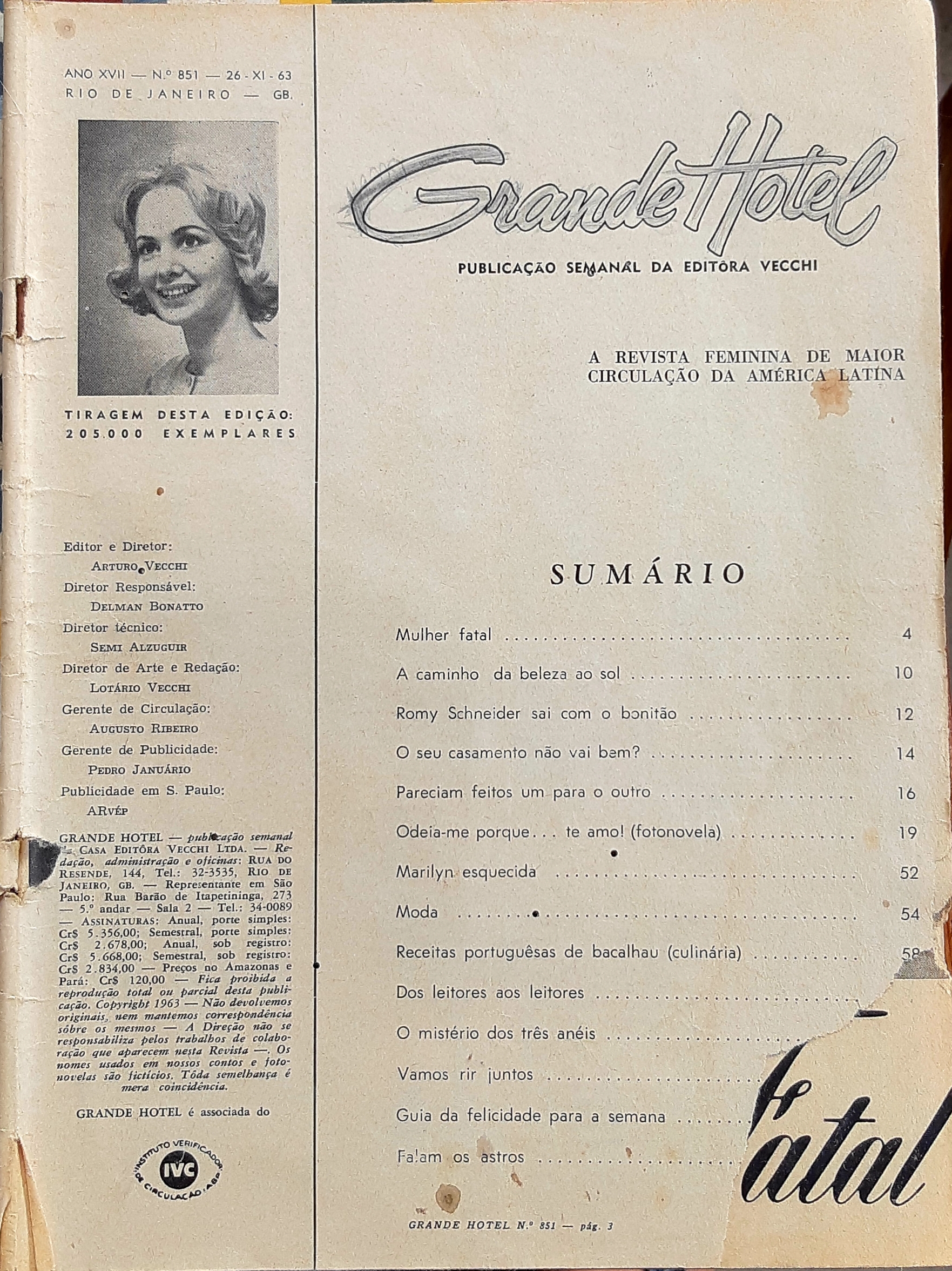 Algumas peças publicitárias que patrocinavam a revista Grande Hotel, edição de 12 de novembro de 1963, traziam à Nova Trento as novidades da moda e lazer das grandes cidades. A revista lazer e entretenimento, produzida no Rio de Janeiro pela editora Vechi, tinha tiragem semanal. Em Nova Trento alguns exemplares chegavam via correio, para famílias mais abastadas do centro da cidade ou por caixeiros viajantes e empregadas domésticas que trabalhavam em Brusque, Blumenau, Tijucas. Juntamente com a popularização dos aparelhos de rádio, as revistas iam abrindo uma janela para o mundo de um município que por décadas manteve-se isolado de quase tudo que acontecia ao seu redor. As fotos foram extraídas de um exemplar encontrado na residência do falecido Gercindo Cipriani, do bairro Cascata.
