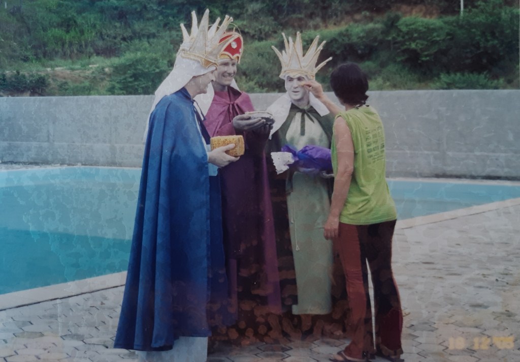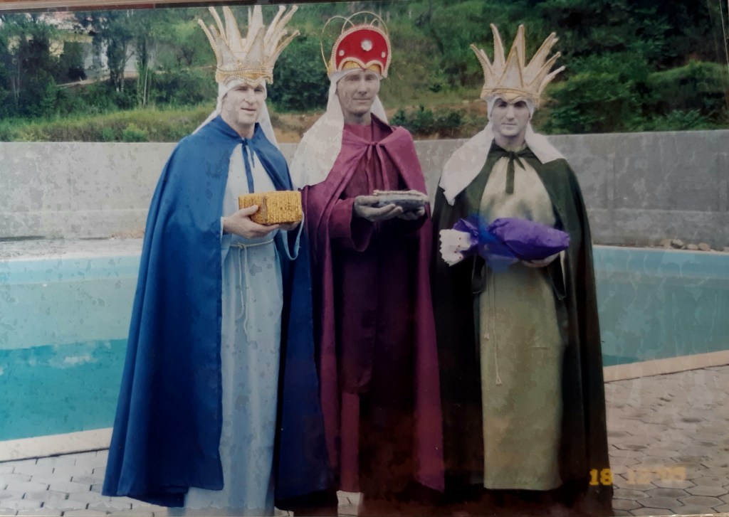 Encenação do presépio, em dezembro de 2005, organizado pelos colaboradores do Circolo Trentino. Da esquerda para a direita: Rino Montibeller, Giovani Dellantonia, Filinto Marchi, maquiadora, Rosimere Tridapalli