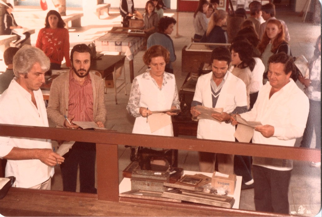 Inauguração da quadra de esportes(quadra aberta, de cimento) em 1977 foi um evento que reunião a comunidade educativa do colégio. Contou com a presença de parte da banda Padre sSabattini.(na foto é possível identicar na primeira fila o musico Ludovico Cadorin, Tarcisio Facchini e Artur Sgrott). Ao fundo, prédio do Sindicato, antigo Banco Inco, Coletoria, Casa do Rádio… no lado da quadra a barraca do churrasco, com a fumaça subindo… Foto: acervo Colégio Farancisco Mazzola. Postagem e comentário: Jonas Cadorin