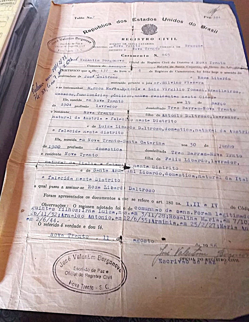 José Daltroso(Daltrozzo) nascido em 19 de março de 1904 lavrador, filho de Antônio Daltroso, natural da Áustria (Ronchi e Luisa Libardo Daltroso, natural da Áustria. Rosa Libardo, nascida em 30 de junho de 1900, filha de Feliz Libardo natural da Itália e Santa Armelini, natural da Itália, ambos moradores na localidade de Três Barras, Nova Trento. Importante destacar que havia uma nítida distinção, de acordo com a certidão de casamento, entre os descendentes de austríacos(do Tirol de língua italiana) e italianos.(Lembrando que a região do Tirol foi anexada a Itália só em 1919).