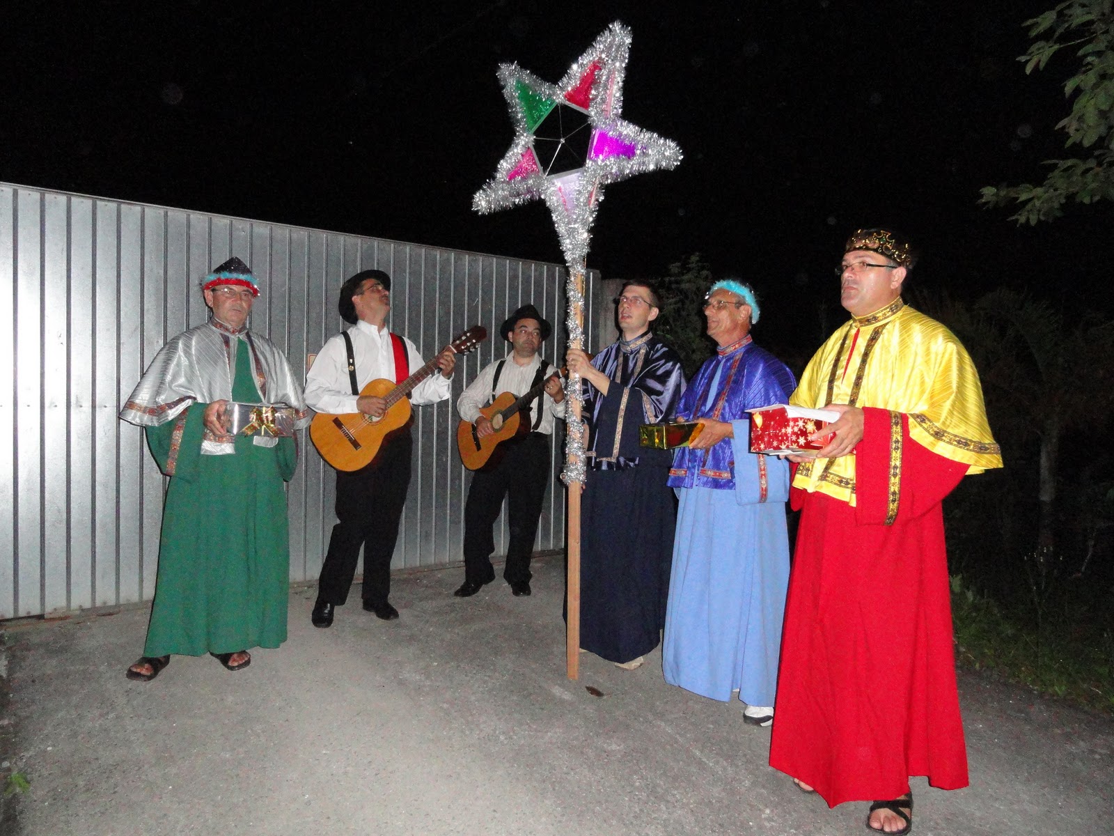 Encenação do presépio, em dezembro de 2005, organizado pelos colaboradores do Circolo Trentino. Da esquerda para a direita: Rino Montibeller, Giovani Dellantonia, Filinto Marchi, maquiadora, Rosimere Tridapalli