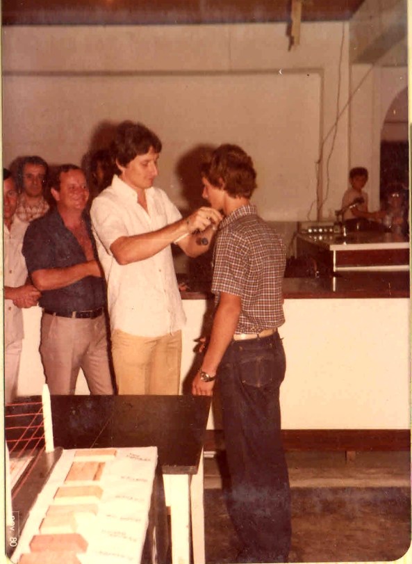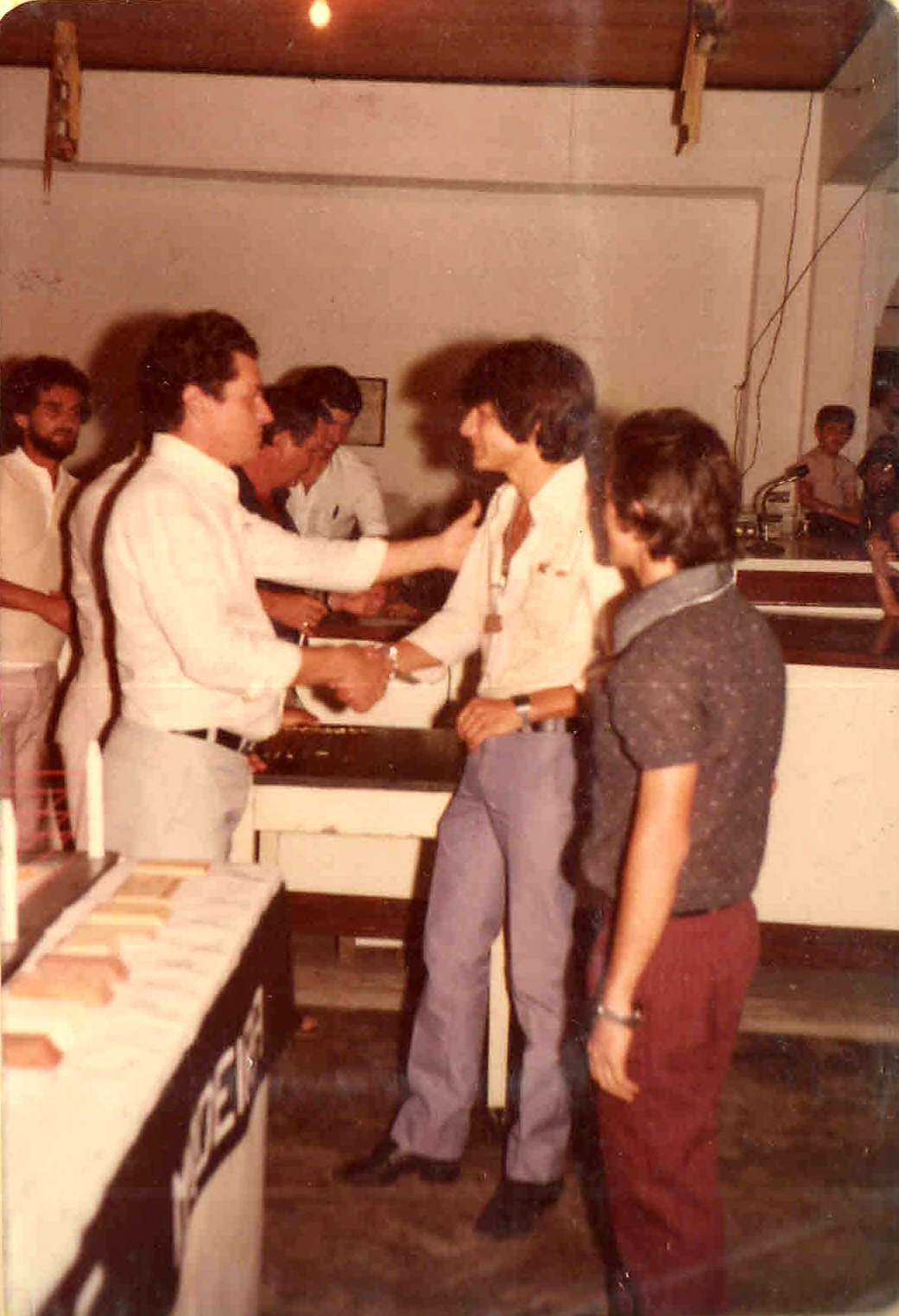 Hercolis Marcos(repórter), Moisés Cipriani (presidente do Circolo) Godofredo l. Tonini, Prefeito. Ao fundo funcionários da prefeitura.
