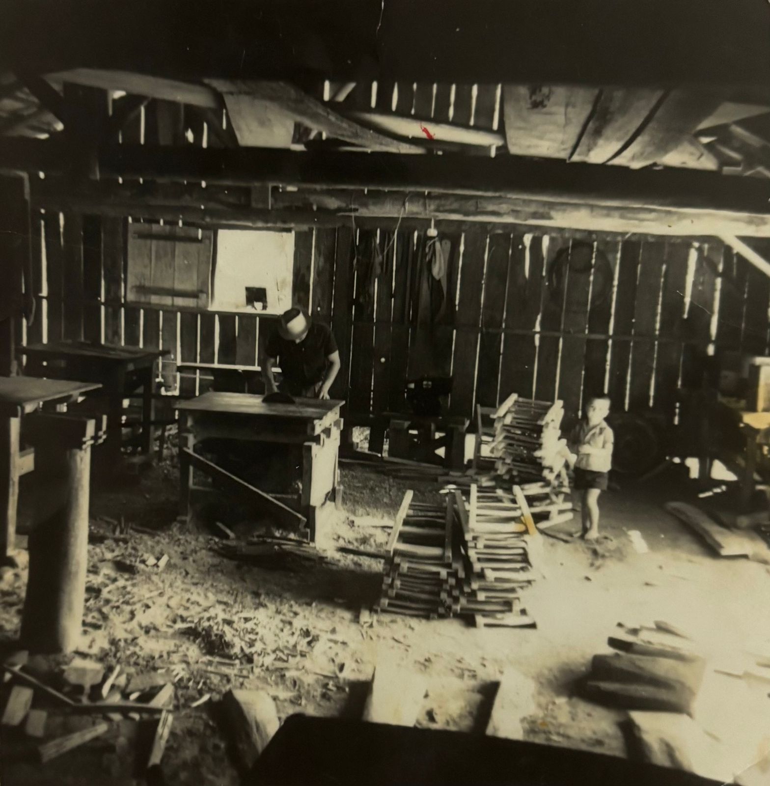 Mario Moresco e seu filho Lademir Moresco na sua oficina de mesas e cadeiras. Os fabricantes de cadeira também eram conhecidos como Caregheta. No Tirol/Trentino era uma profissão exercida de forma itinerante. Os careguetas passavam pelas vilas, levando suas ferramentas, oferecendo serviço de produção ou reforma de cadeiras, inclusive empalhamento. Atualmente o distrito de Claraíba, Nova Trento, concentra vários fabricantes de cadeira, apreciadas pelo esmero no fabrico, herança dos antepassados.