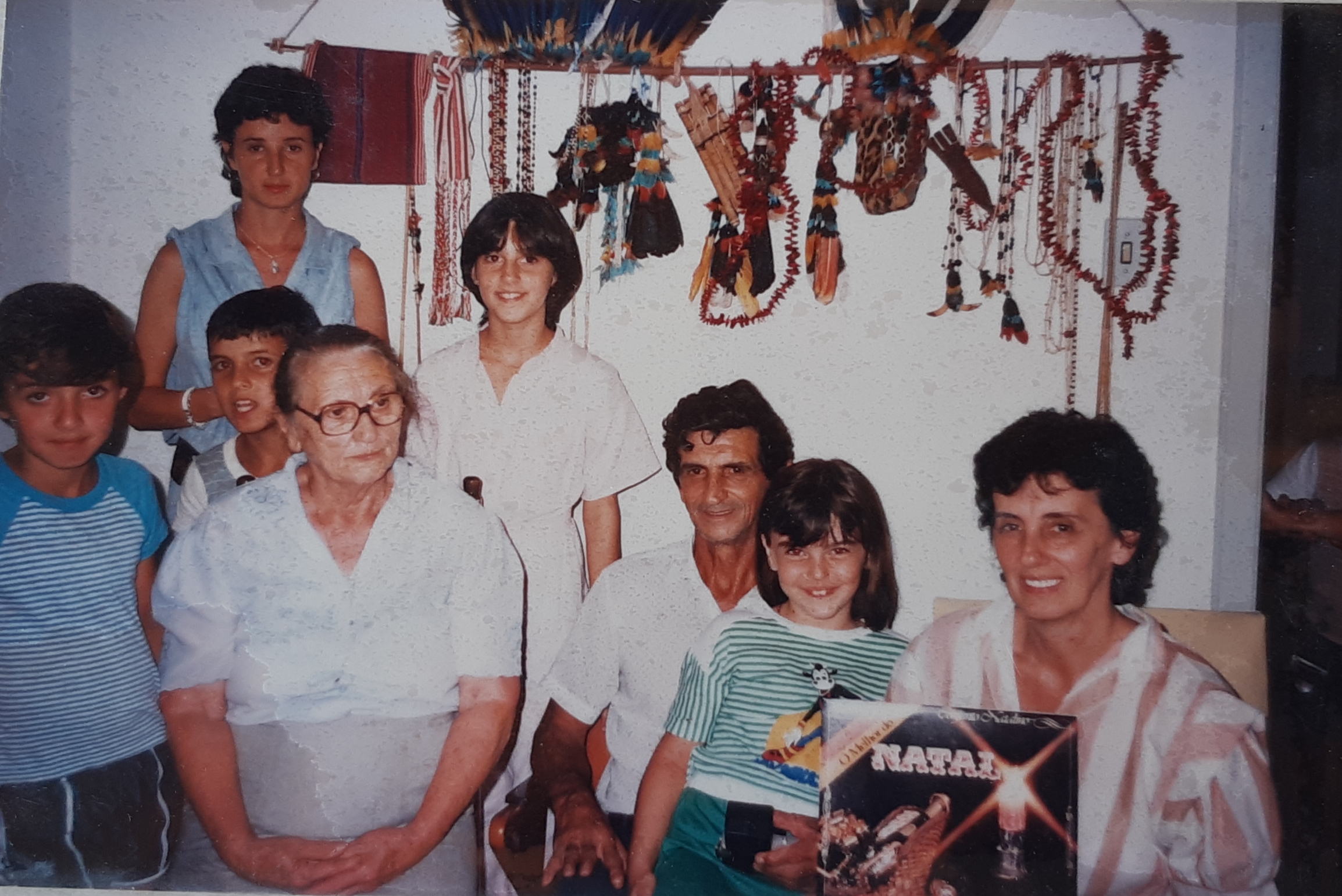 Visita do Grupo Folclórico do Circolo Trentino a residência da viúva Sr.ª Maria Valle de Oliveira( Dona Maricota), residente à rua Santo Inácio, em companhia dos filhos : padre Arlindo, Cacilda e dos netos Luiza Silva, Fernanda Tonini, Rafael, Júlio e Cezar de Oliveira em 21 de dezembro de 1986.( Ao fundo artesanato indigena que o padre Arlindo trazia das comunidades onde trabalhava no Mato grosso. Dona Maricota os trocava por peças de roupa que o filho levava aos indígenas.)
