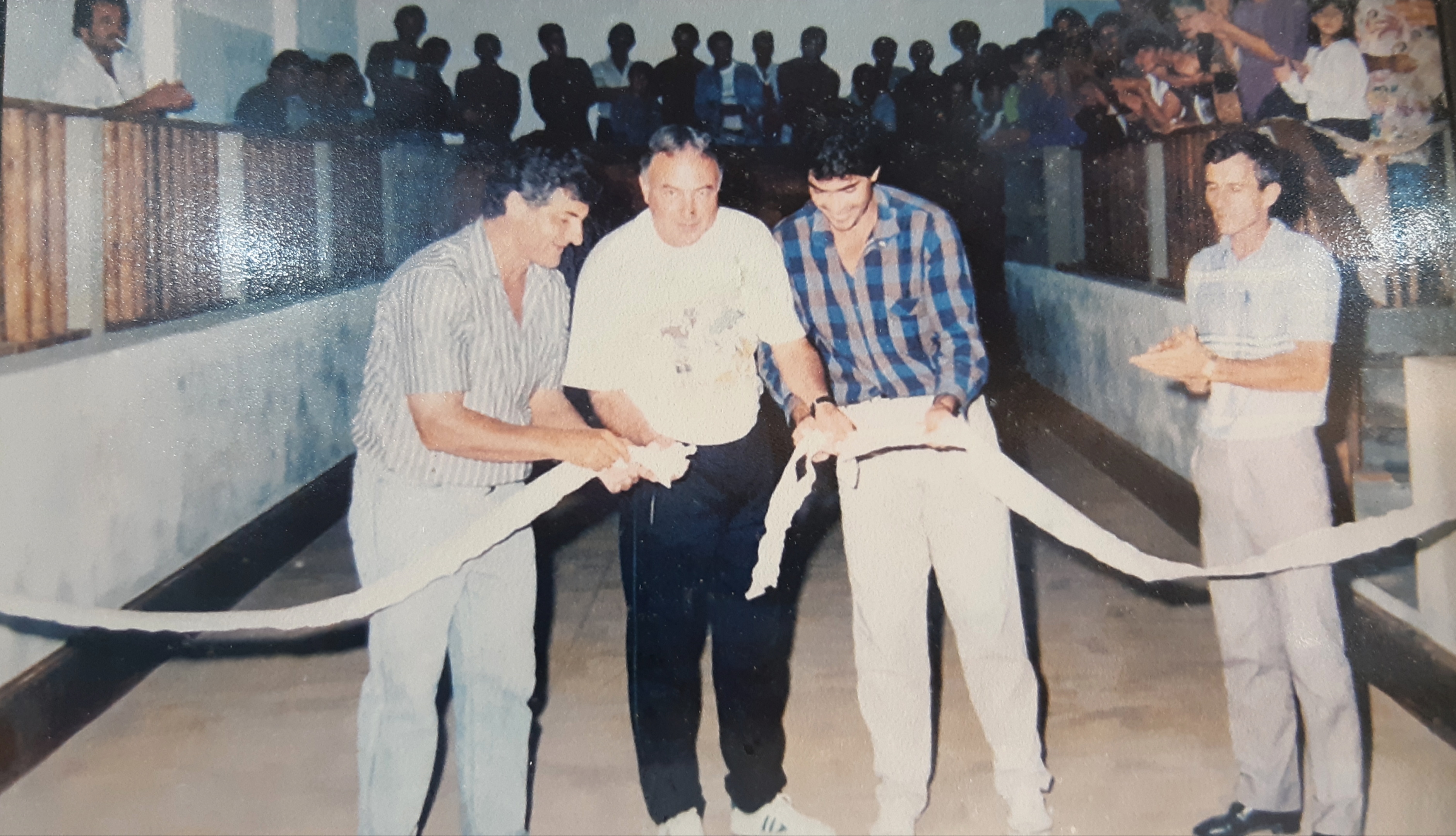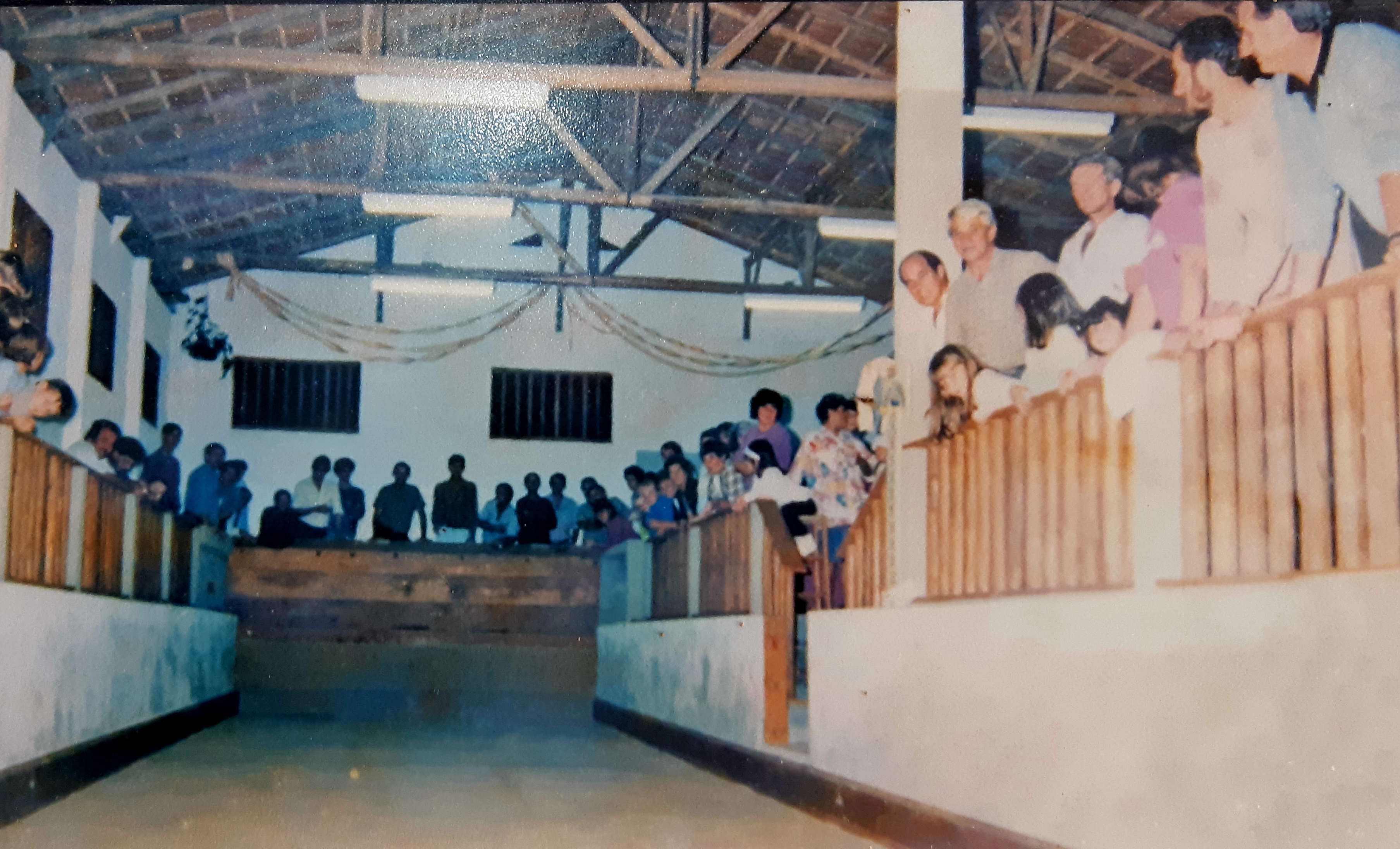 24,09,1991- Isidoro Maçaneiro e Saulo Cadorin, açougueiros do açougue do Fabio exibindo um boi que depois de abatido pesou 34,5 arroubas.( O boi pertencia ao sr… Capraro, do bairro Vígolo. Bois como este eram usados em serviços agrícolas e quando velhos eram vendidos aos açougues)A foto registra o prédio onde funcionou o açougue do Sr. Fábio Raulino, casado com Albertina Darós, localizado na rua João Bayer Sobrinho. O açougue marcou uma época em que se comprava carne bovina e suína em abatedouros – açougues- onde os animais eram abatidos nas primeiras horas da manhã e depois de esquartejados eram comercializados no balcão na parte da frente. Sr Fábio foi o último açougueiro a manter este tipo de de comércio.(Antes dele e contemporâneos a ele também havia o açougue do do Angelim Dalri, no Salto e do Érico Corsi, na subida do Moro da Cruz. O sr. Aprígio Botamelli, esporadicamente também comercializava carne ,de porta em porta de animais que abatia em casa). Importante lembrar que neste período o regramento sanitário para o abate e comercialização de carne ainda eram incipientes o que não impedia dos açougueiros de exercer sua profissão com responsabilidade zelando pela higiene possível para os padrões daquele tempo. Fábio era o açougueiro proprietário e responsável por uma equipe de profissionais como Isidoro Maçaneiro, Saulo Cadorin, Leodelides (Lidi) Michelli, Nestor Raulino, … Orsi(Zorro).Foto realizada em nos idos dos anos dois mil quando o local já estava fechado. O ambiente era onde acontecia os abates era todo pintado de branco e uma calha com água corrente ajudava a higienizar o espaço e evitar a propagação de insetos como moscas. Ao lado do abatedouro fica a mangueira onde os animais a serem abatidos ficavam aguardando sua vez! O açougue do Fábio era também um espaço onde as crianças iam presenciar o fadigoso trabalho dos açougueiros.. Quando o boi fugia era uma festa!
