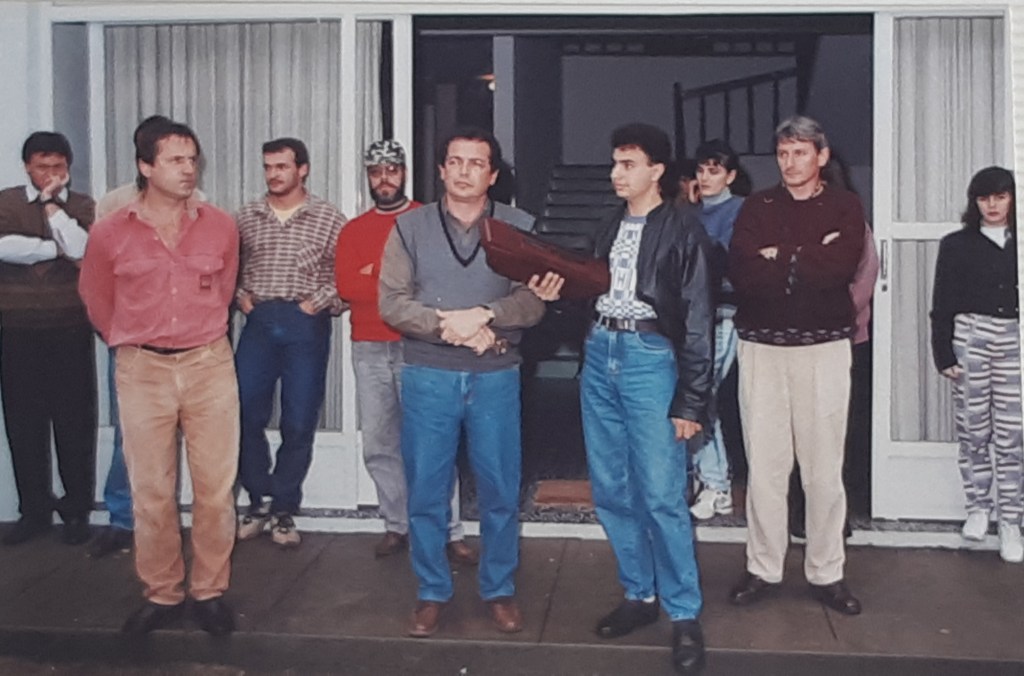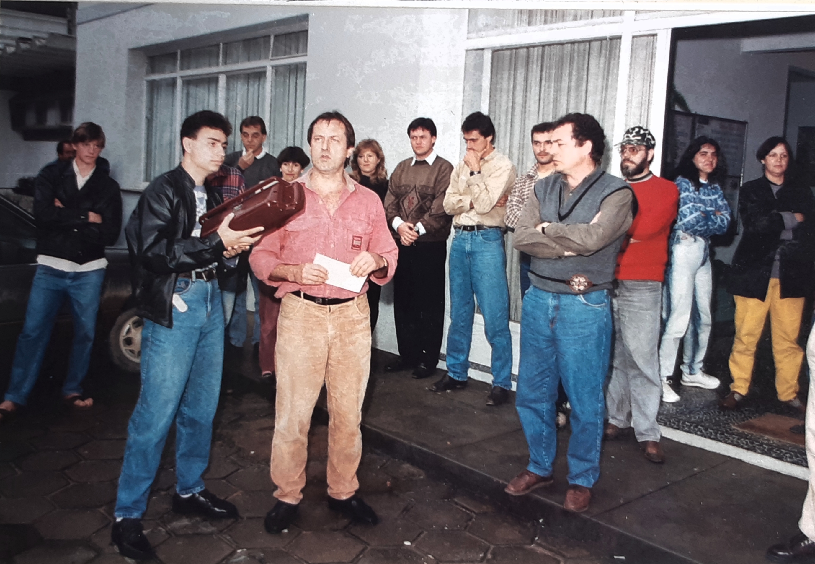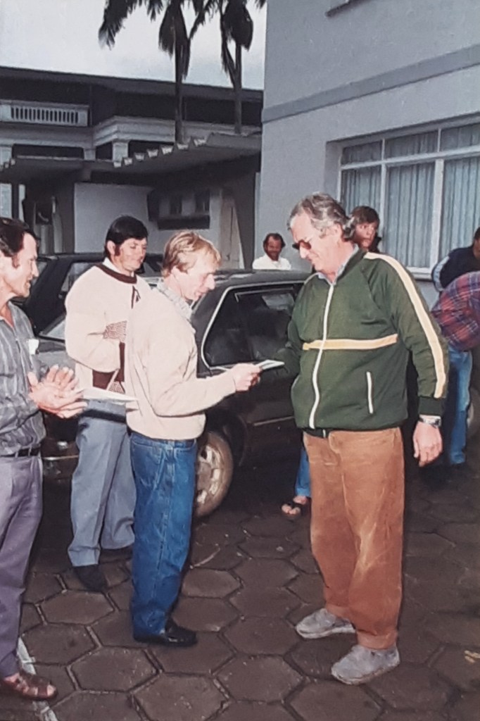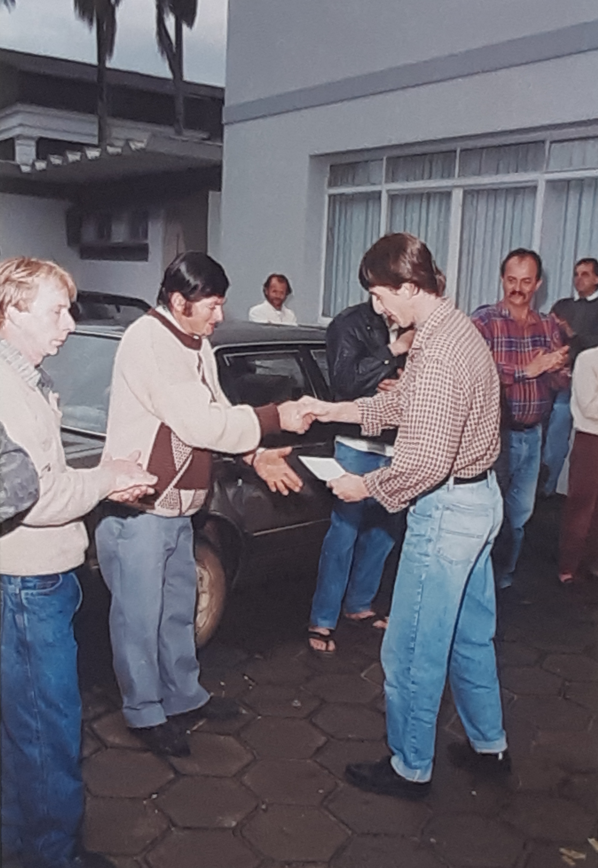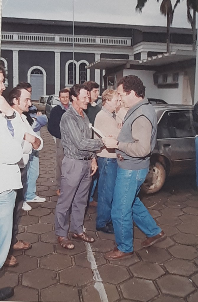 Hercolis Marcos(repórter), Moisés Cipriani (presidente do Circolo) Godofredo l. Tonini, Prefeito. Ao fundo funcionários da prefeitura.