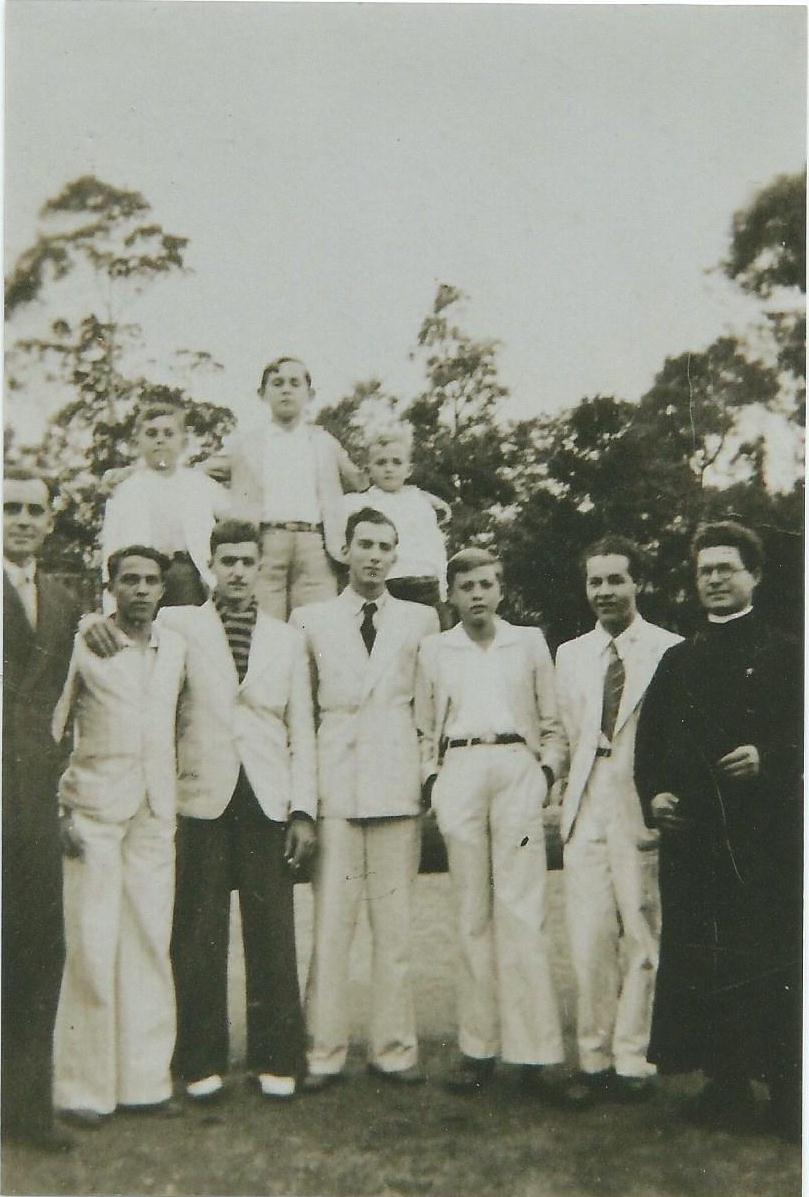 Padre Ludovino Santini com um grupo de seminaristas menores diante da casa casa paroquial dos padre jesuítas em Nova Trento . Os seminaristas vestem uniforme escolar com as insígnias da Cruzada Eucarística ou Congregação Mariana (a falta de nitidez da foto não preminente precisar ). No frontispício da casa o monograma JHS – Iesus Hominum Salvator” (Jesus Salvador dos Homens). Este monograma é formado pelas três primeiras letras da palavra Jesus em Grego, Ihsus. O símbolo foi criado por São Bernadino de Sena, no século XV, e posteriormente foi adotado por Santo Inácio de Loyola, em meados do século XVI. A casa localizava-se na lateral esquerda da atual igreja matriz e iniciava onde está construída a casa do ex prefeito Santino Ludovino Voltolini. Próximo ao poste da iluminação pública está afixado um quadro com a imagem do, então papa, Pio XII ( pontificado de 1939-1958)