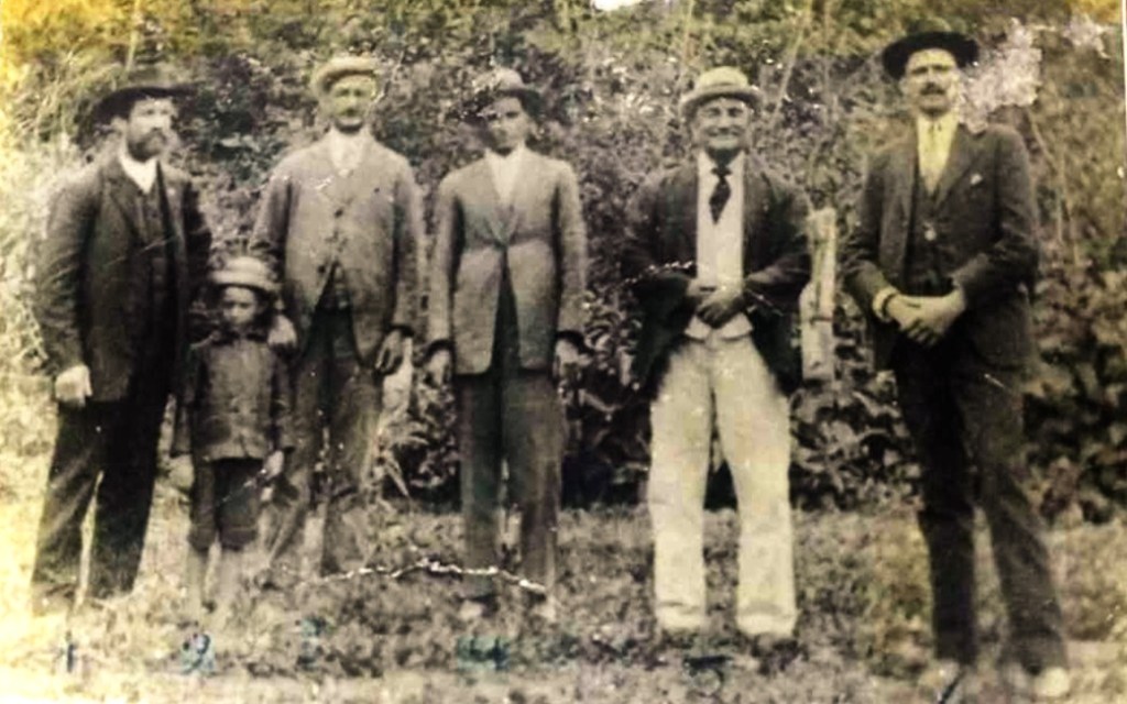jan 25 2025 1919 – ENERGIA ELÉTRICA EM NOVA TRENTO Instalação da energia elétrica em Nova Trento no ano de 1919. da esquerda para a direita: Augusto Shneider, Lelo Bauer(criança), Jacob Bauer, Pedro Gonçalves, João Bauer e Nicolau Bado, prefeito. Colaboração :Ronaldo Raulino. Postagem: Jonas Cadorin