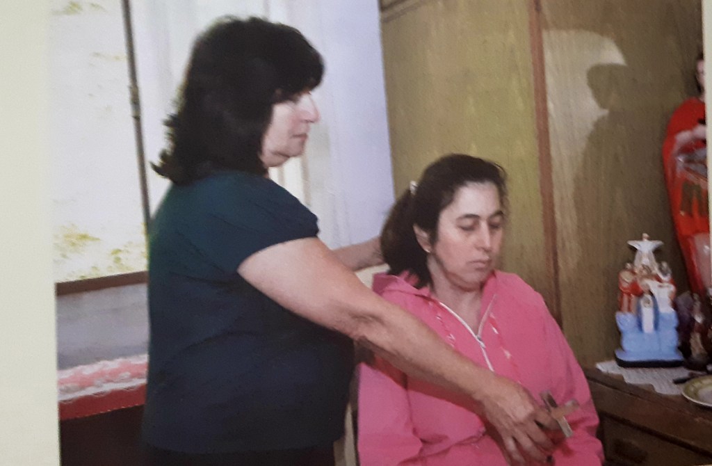 Natalia Vinotti durante a benzedura para o sangue ‘louco’ ou hemorragia. Com um crucifixo na mão a benzedeira faz o sinal da Cruz sobre o paciente em seguida recita uma fórmula mágica, benzendo o/a paciente de cima para baixo com uma faca.