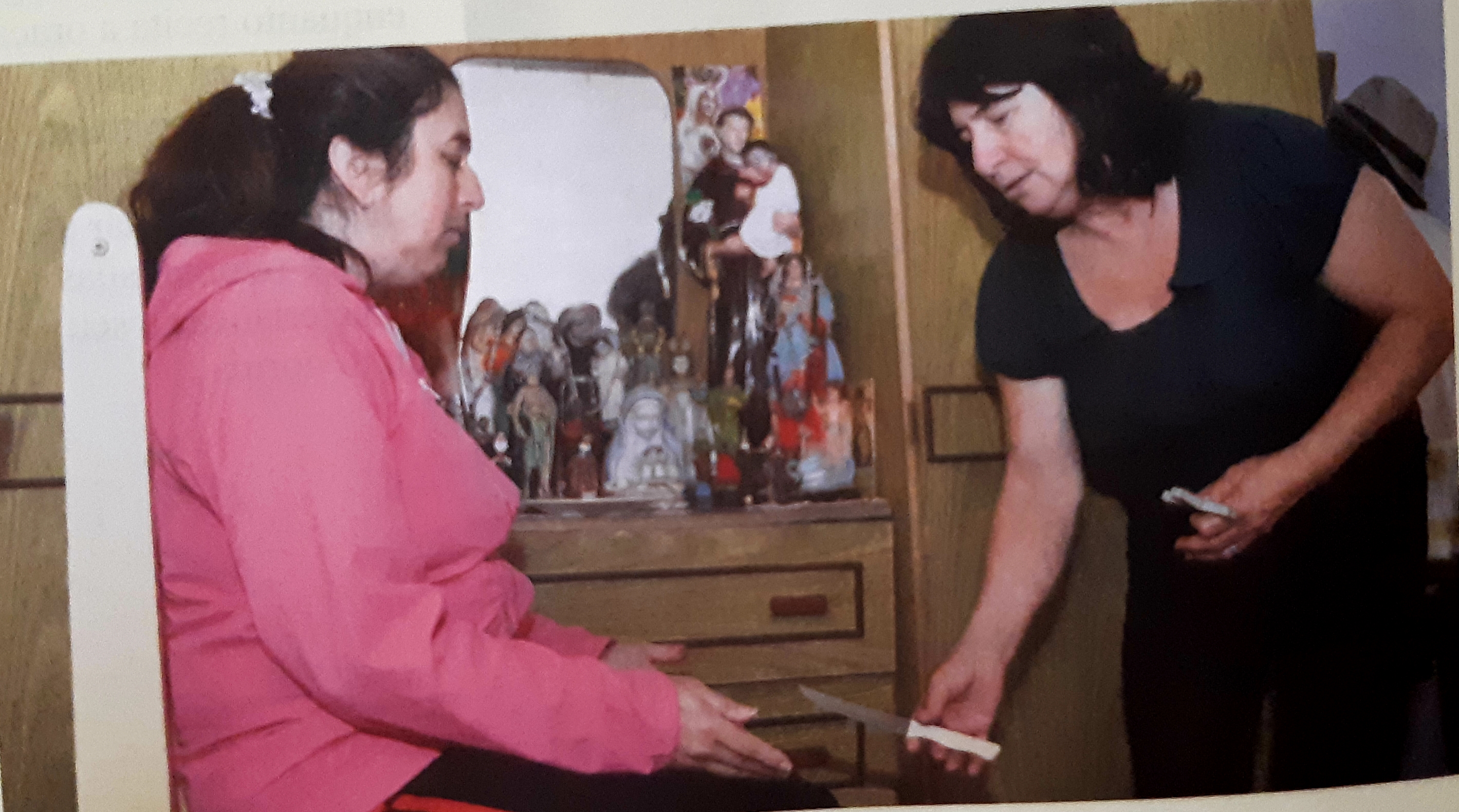 Natalia Vinotti durante a benzedura para o sangue ‘louco’ ou hemorragia. Com um crucifixo na mão a benzedeira faz o sinal da Cruz sobre o paciente em seguida recita uma fórmula mágica, benzendo o/a paciente de cima para baixo com uma faca.