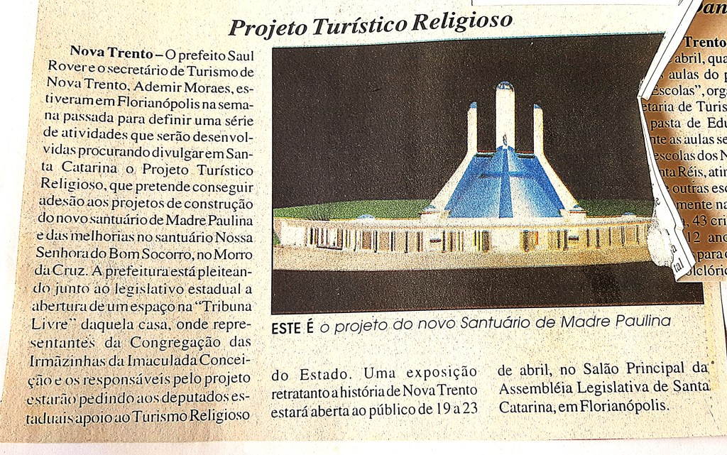 O Jornal O Município de 01 de abril de 1999 noticiava o lançamento do projeto para construção do santuário Santa Paulina. O Projeto futurista assinado pelo então arquiteto da prefeitura Alfredo Cadorin(in memoriam) não foi executado por motivos de inviabilidade técnica para a execução. Novos estudos levaram a aprovação do projeto da basílica atual.